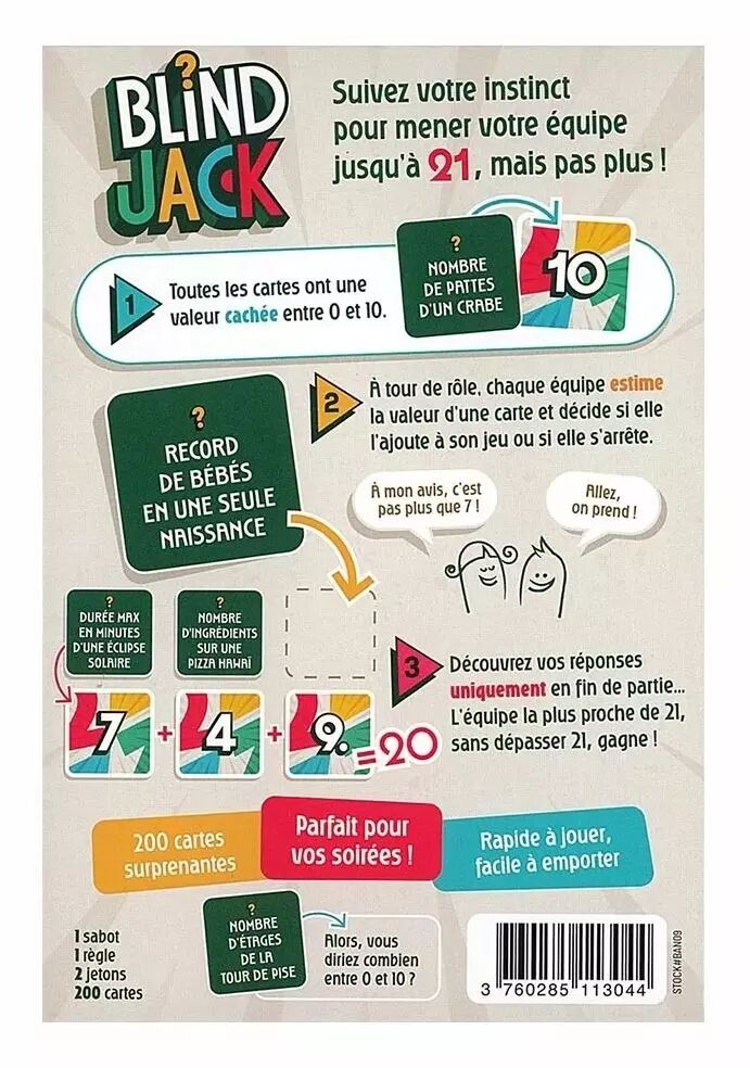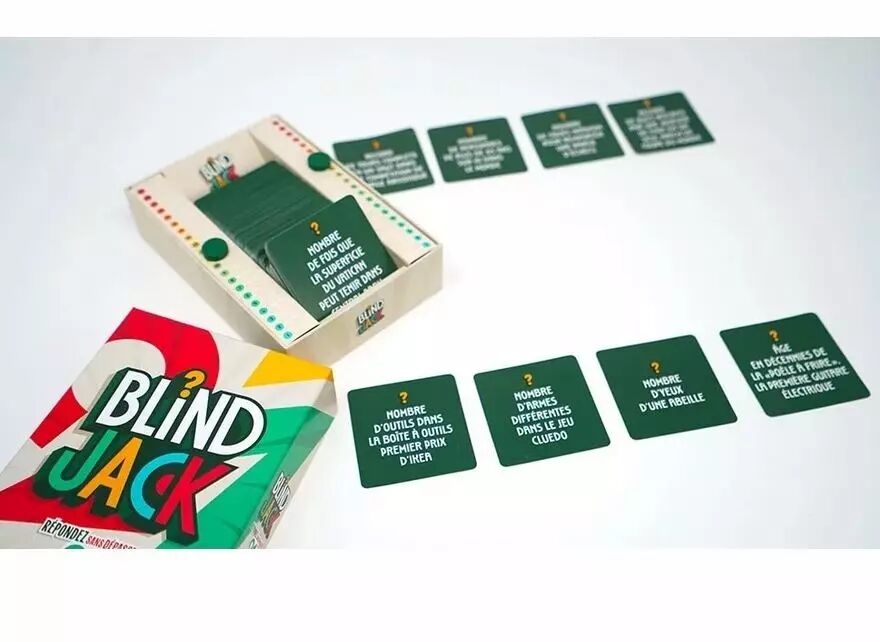 Blind Jack s’impose comme le jeu de société parfait pour créer une ambiance conviviale, que ce soit en famille, entre amis ou même lors d’un apéro. Grâce à ses règles ultra simples et son format rapide, il met tout le monde dans l’ambiance dès la première carte. Les parties durent environ 15 minutes, ce qui permet d’enchaîner les manches et de varier les équipes pour encore plus de fun.