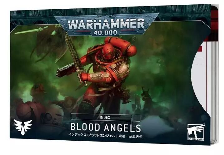 - 3x Cartes d'Index Blood Angels, détaillant les règles d'armée de la faction et le Détachement Fils de Sanguinius