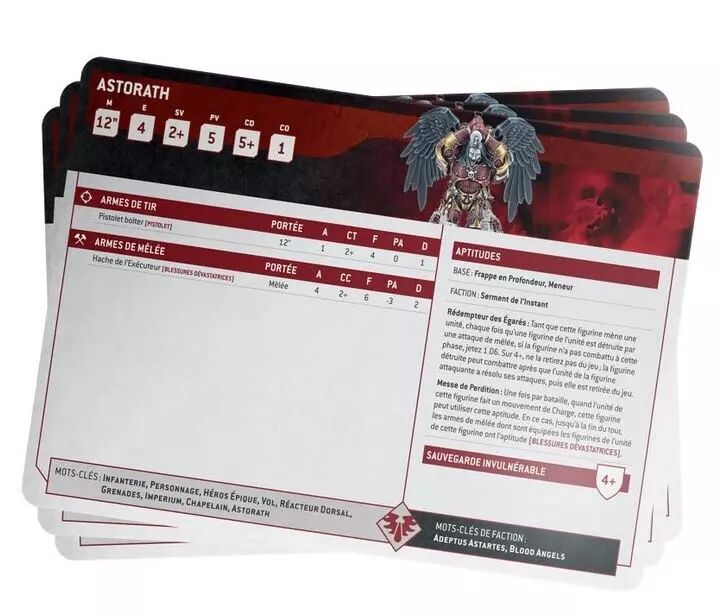 - 18x Cartes de Fiche Technique Blood Angels: Astorath, Predator Baal, Frère Corbulo, Capitaine Tycho, Maître Archiviste Méphiston, Commandeur Dante, Dreadnought de la Compagnie de la Mort, Intercessors de la Compagnie de la Mort, Marines de la Compagnie de la Mort, Marines de la Compagnie de la Mort à Réacteurs Dorsaux, Dreadnought Furioso, Lemartes, Dreadnought Archiviste, Garde Sanguinienne, Prêtre Sanguinien, Prêtre Sanguinien à Réacteur Dorsal, Le Sanguinor, Tycho l’Égaré