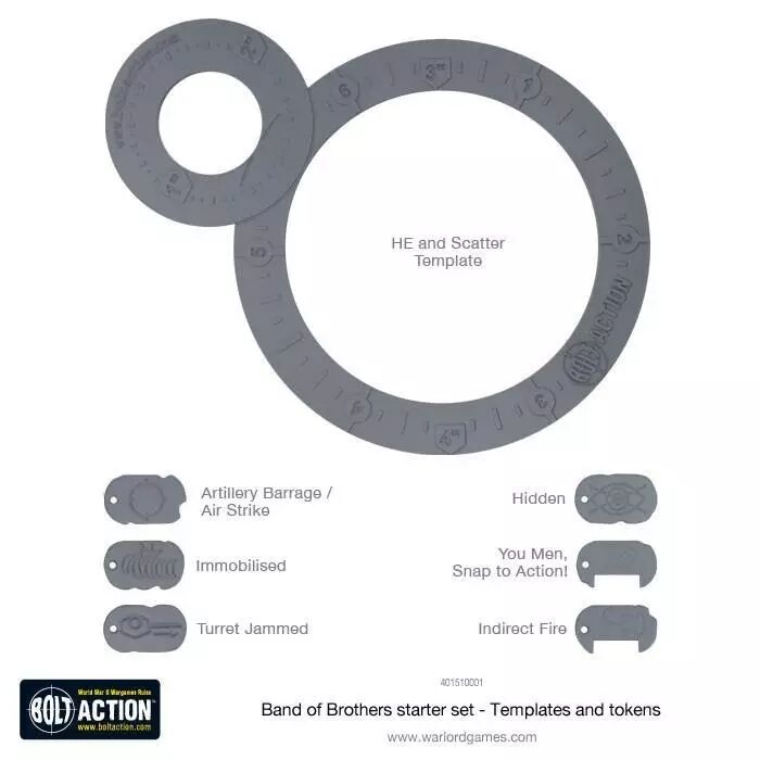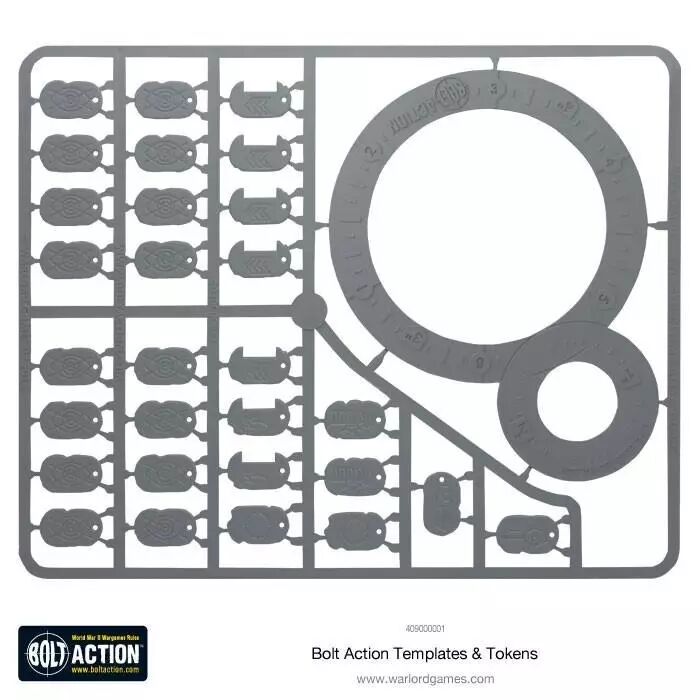 Réf. : 409000001 Tout nouveau pour la deuxième édition de Bolt Action ! Tous les jetons nécessaires pour suivre les actions de vos escouades et d'autres rappels utiles, ainsi que le nouveau gabarit essentiel pour les munitions hautement explosives (HE) - plus l'artillerie est grosse, plus la zone est grande !