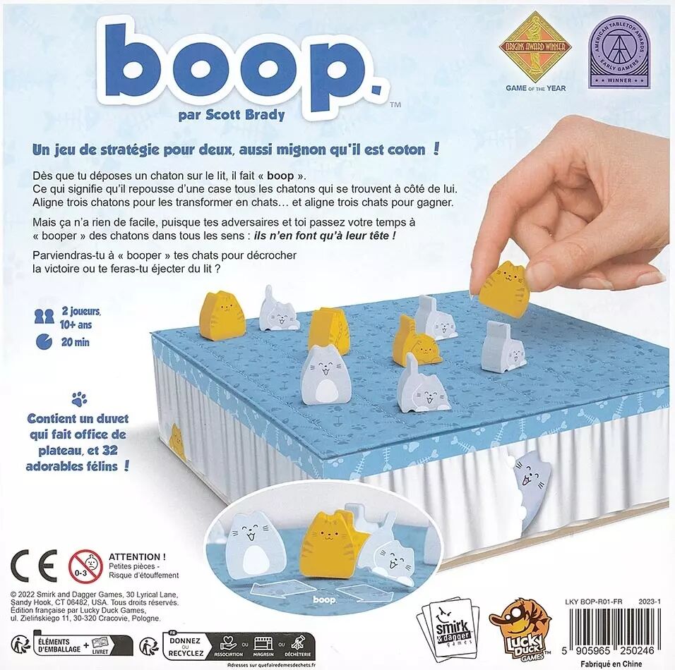Aligne trois chatons pour les transformer en chats… et aligne trois chats pour gagner. Mais ça n’a rien de facile, puisque tes adversaires et toi passez votre temps à « booper » des chatons dans tous les sens : ils n’en font qu’à leur tête ! Parviendras-tu à « booper » tes chats pour décrocher la victoire ou te feras-tu éjecter du lit ?