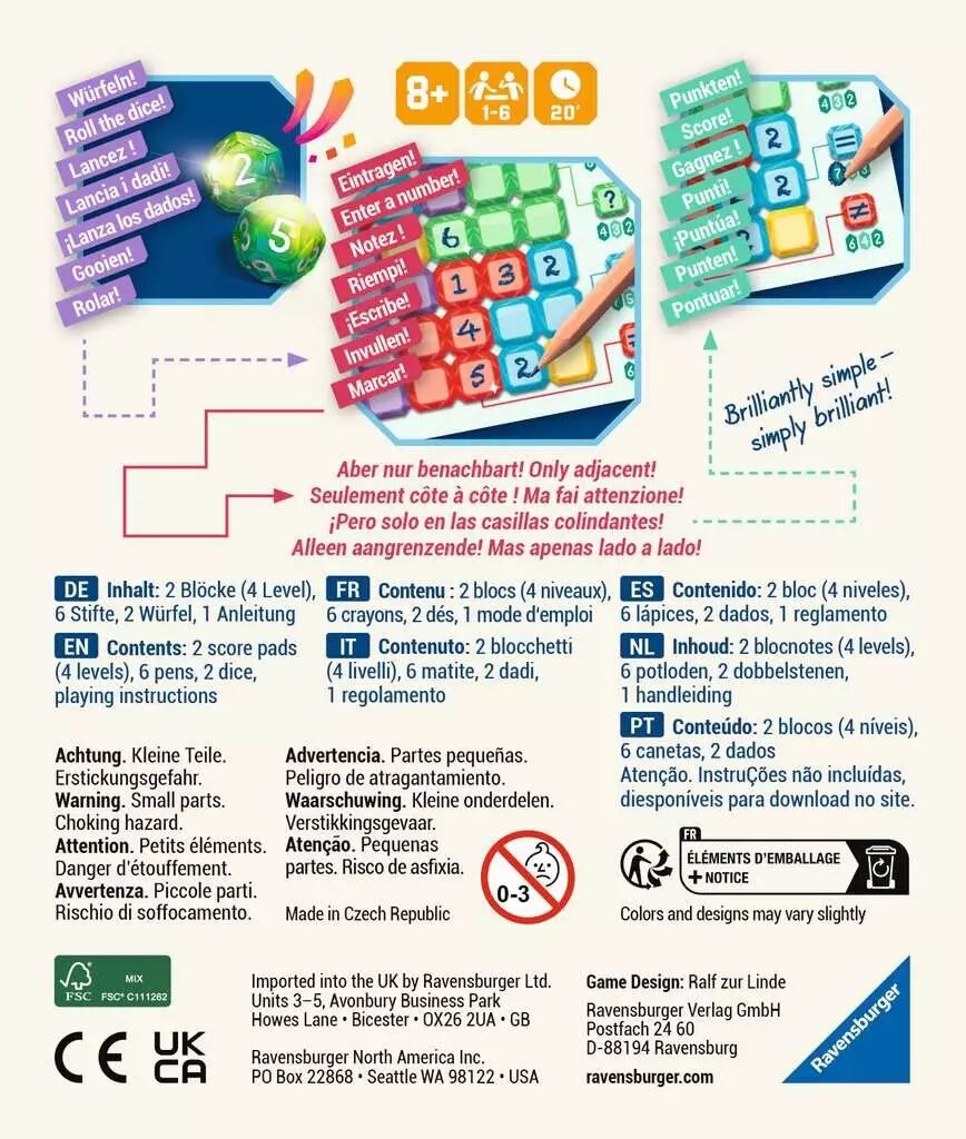 Brilliant est un jeu de société de type roll & write, accessible et familial, édité par Ravensburger. Il s’adresse à des enfants à partir de 8 ans ainsi qu’aux adultes qui aiment les petits jeux de dés malins. Une partie dure environ 20 à 30 minutes, ce qui permet d’enchaîner facilement plusieurs manches ou de le glisser en début ou fin de soirée. Le jeu se pratique de 1 à 6 joueurs, avec un mode solo basé sur le même principe de remplissage de grilles et de seuil de score à atteindre. La boîte contient 2 dés à douze faces colorés, 2 blocs de feuilles de score avec différents niveaux, 6 crayons et la règle du jeu.