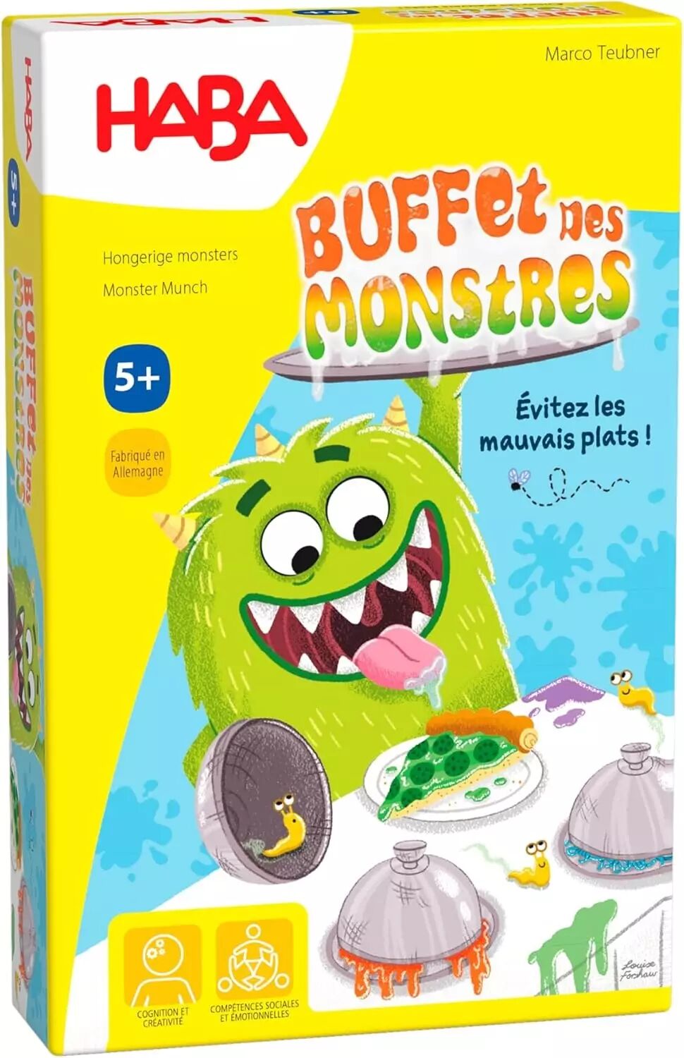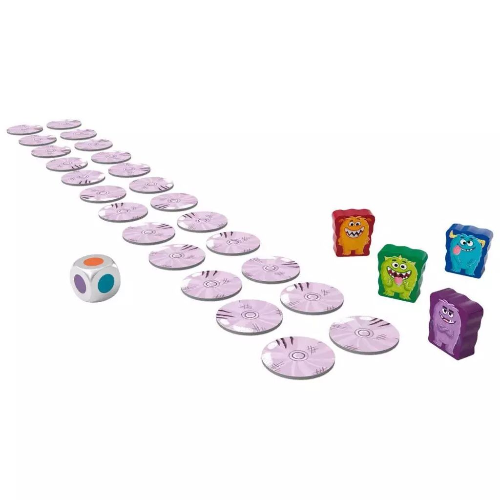 Super car les monstres ont très faim ! Les enfants retournent autant de plats que possible pour progresser rapidement le long du buffet. Si, les enfants retournent un plat de la couleur du dé, ils doivent revenir au début. Il faut bien mémoriser les emplacements des plats que les monstres n’aiment pas pour ne pas se faire avoir. Le premier à avoir parcouru le buffet dans un sens puis dans l’autre remporte la partie.