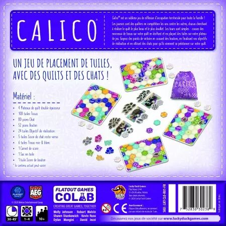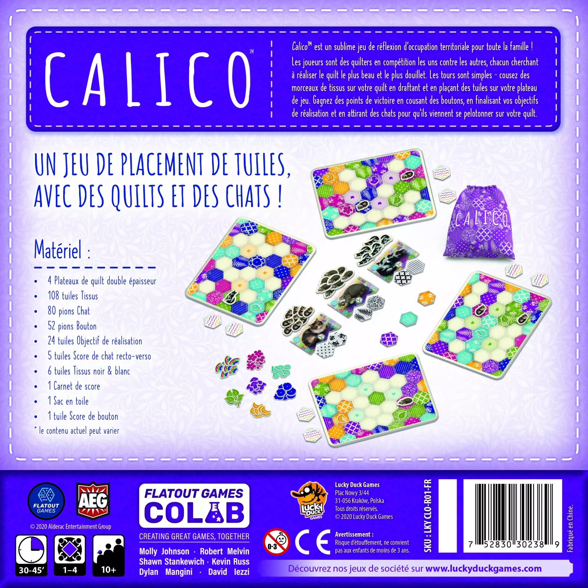 Réf. : JDPLDG035 Dans Calico, les joueurs, en compétition les uns contre les autres, vont tenter de composer le quilt le plus douillet en draftant et en plaçant des tuiles de tissus de différentes couleurs et différents motifs sur leur Plateau de quilt. Chaque Plateau de quilt comporte 3 Objectifs de réalisation qui rapporteront des points si les prérequis sont respectés. Les joueurs vont également tenter de composer des groupes de motifs afin d'attirer les Chats les plus câlins, et d'obtenir des regroupements de couleurs sur lesquels coudre des Boutons. Le joueur qui gagnera le plus de points grâce a ses Objectifs de réalisation, ses Chats et ses Boutons l'emportera !