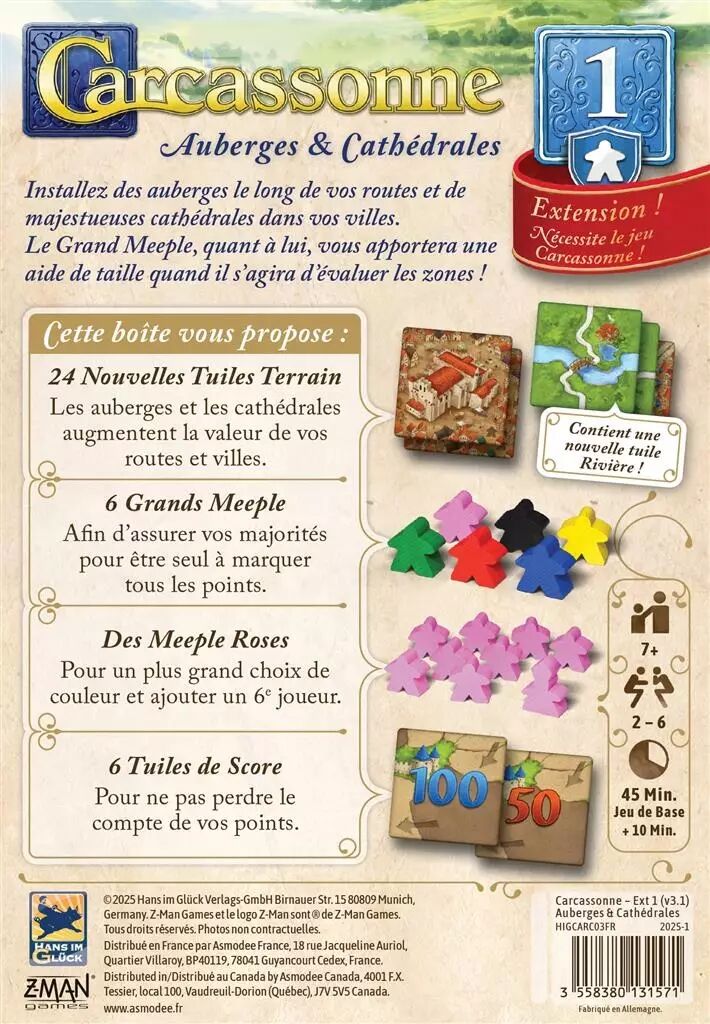 Avec l'extension Carcassonne Auberges & Cathédrales, installez des auberges le long des routes et des cathédrales au cœur des villes. Les auberges augmentent la valeur des routes complètes à 2 points par tuile. Les cathédrales rendent les villes encore plus lucratives en rapportant 3 points par tuile et blason… à condition qu’elles soient terminées ! Le Grand Meeple compte pour deux meeple classiques, offrant un avantage de poids dans la lutte pour le contrôle. Il vous apporte une présence renforcée dans les zones à majorité. Cette extension contient également du matériel de couleur rose pour ajouter un 6ᵉ joueur à vos parties.