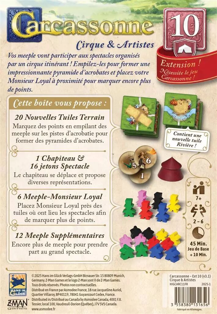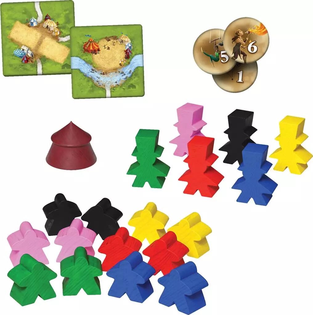 Avec l'extension Cirque & Artistes, vos meeple deviennent des artistes de cirque, prêts à se produire en ville, sur les routes ou les prés pour divertir la population… et vous faire marquer toujours plus de points ! Cette extension amusante repose sur deux mécaniques originales. D’abord, les tuiles Acrobatie vous permettent d’empiler vos meeple pour former une pyramide humaine. Dès que trois acrobates se retrouvent sur la même tuile, ils peuvent être évalués pour rapporter 5 points chacun. Ensuite, les tuiles avec piste de cirque accueillent un jeton Spectacle caché, qui sera révélé plus tard pour attribuer des points aux meeple situés autour.