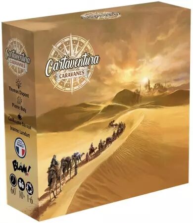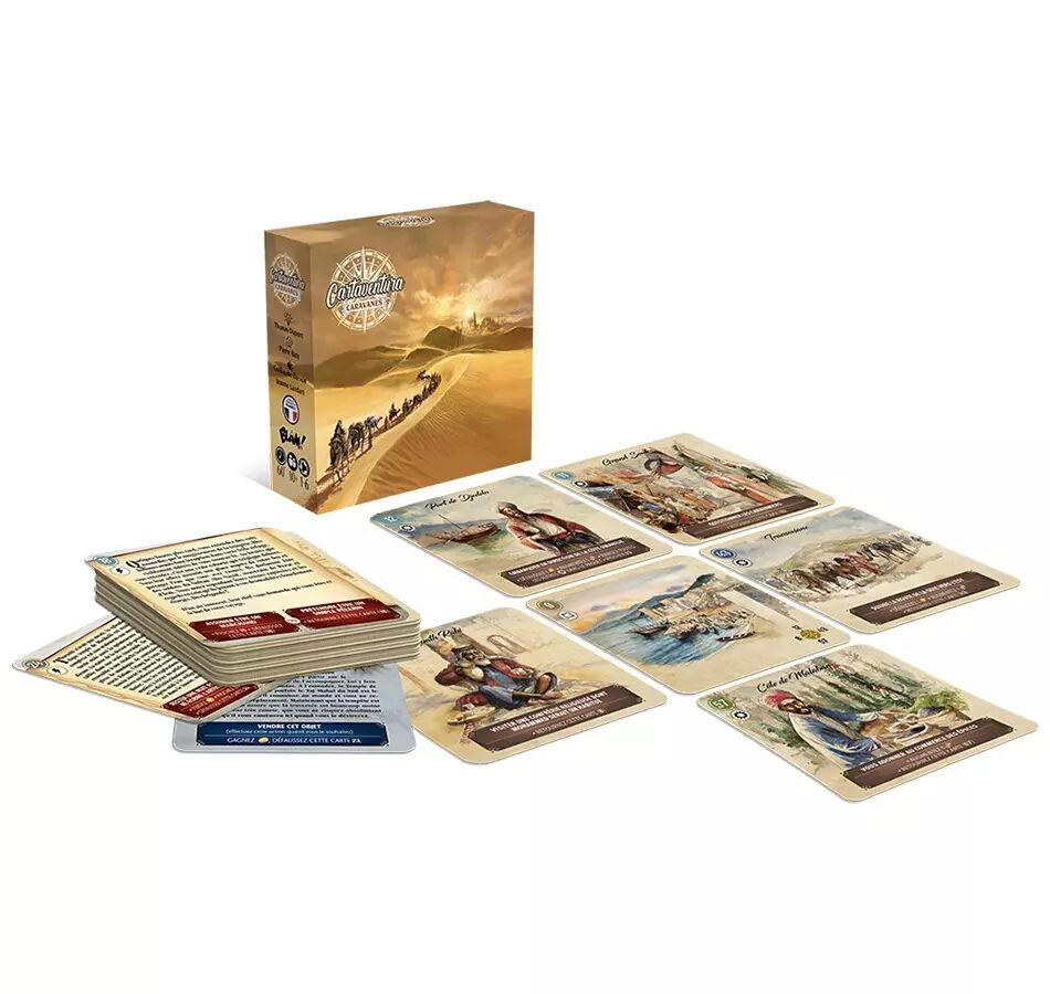 Cartaventura propose des jeux dans différentes époques, chacune retranscrite avec qualité et fidélité. Les joueurs replongent dans l'Histoire grâce à des scénarios riches et des illustrations à l'aquarelle, en hommage aux carnets de voyage. Un livret historique, rédigé avec des spécialistes, offre un complément d'information. Cartaventura propose un tutoriel qui accompagne la première partie. Son système de jeu simple et inédit permet d'explorer le scénario plusieurs fois afin de découvrir tous les secrets du jeu. Grâce à ce qu'ils auront appris et à l'aide de choix différents, ils pourront optimiser leur aventure afin de découvrir toutes les fins possibles. --- CARAVANES 1331, Tanger. Vous avez fait mille fois le tour de votre province dans le sillage de votre marchand de père. Votre cousin Mohamed, lui, explore le vaste monde ; ses lettres vous font rêver de pays merveilleux et de sultans légendaires. Lorsque son père tombe malade, vous décidez de partir à sa recherche. L'Orient infini vous ouvre les bras, enfin. Triompherez-vous des montagnes et des déserts ? Deviendrez-vous un riche marchand ou un humble fakir ? Saurez-vous amadouer les khans mongols et les rajas de l’Inde ? Retrouverez-vous la trace de votre insaisissable cousin, que l’Histoire retiendra comme le plus grand voyageur du monde ?