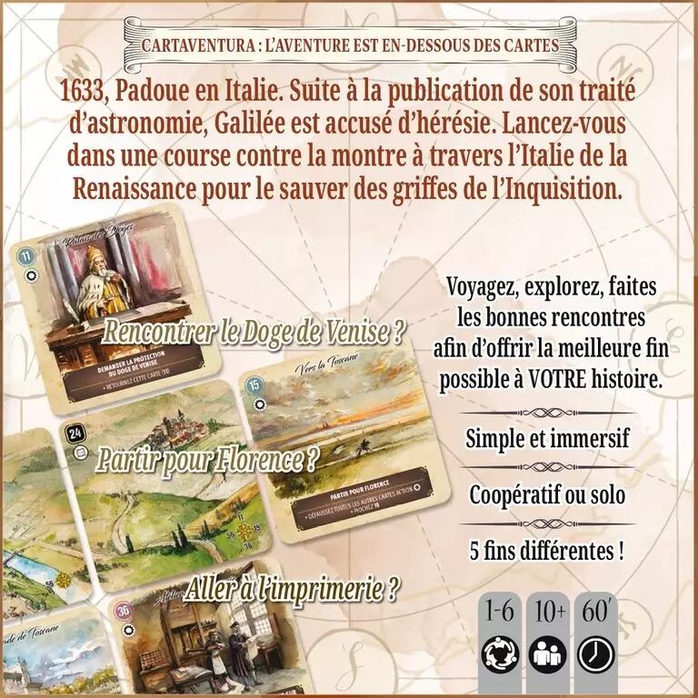 1633, Padoue en Italie. Vous êtes l'un des disciples de Galilée, illustre scientifique qui a déjà révolutionné plusieurs fois l'astronomie et la mécanique. Votre maître vous appelle à l'aide car il est sur le point d'être jugé à Rome pour hérésie. La publication de son traité d'astronomie lui a en effet attiré les foudres de l'Inquisition. Parviendrez-vous à réunir suffisamment d'éléments pour convaincre les acteurs de ce procès de changer d'avis ?