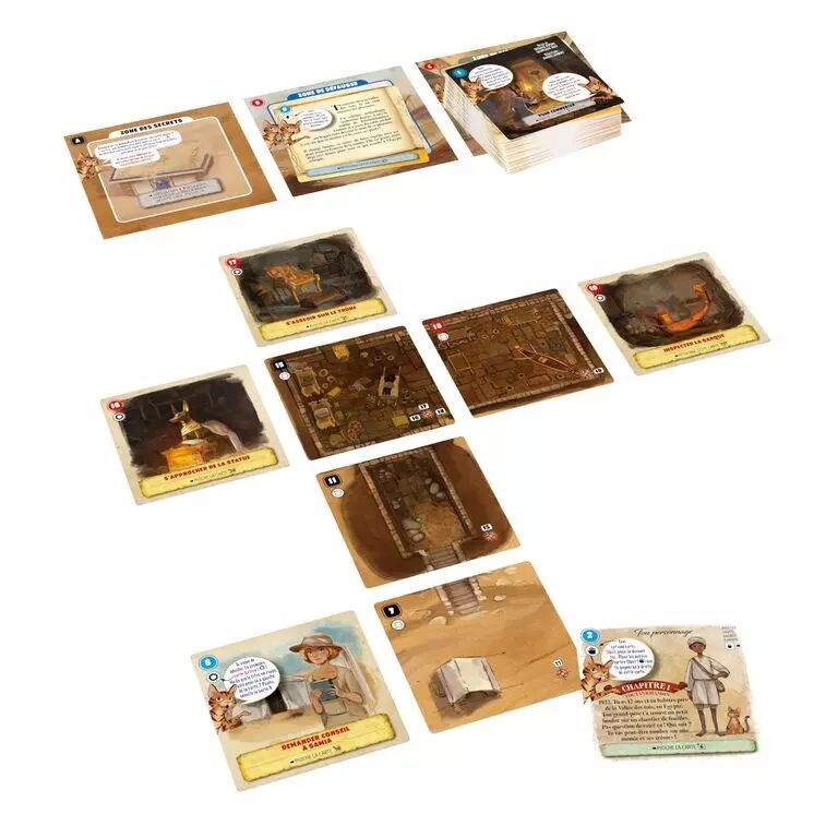 Chaque scénario de Cartaventura Odyssée se compose de 3 chapitres d'une vingtaine de minutes chacun. Au fil des parties, les joueurs révèlent des cartes secrètes qui donnent accès à de nouvelles portions de l'histoire. En rejouant l'aventure, ils peuvent ainsi découvrir toutes les fins possibles. Pendant leur aventure, ils débloquent également les 10 cartes Savoir pour apprendre l'histoire de l'Egypte antique tout en s'amusant.