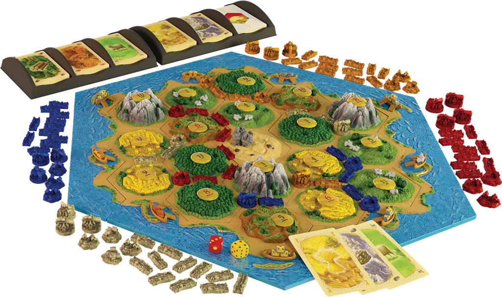 À chaque tour, des dés sont lancés pour déterminer quelles ressources - mouton, blé, bois, brique et minerai - l'île produit. Les joueurs dépensent ces ressources pour construire des colonies, des routes et des villes et pour acheter des cartes de développement qui ont différents effets.