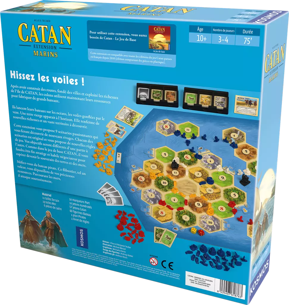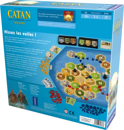 La boîte vous propose 9 voyages qui constituent un itinéraire et feront revivre l'histoire de Catan ! Méfiez-vous du bateau pirate. Ce flibustier, tel un voleur, vous dépouillera de vos précieuses ressources.