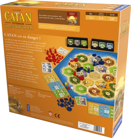 Avec cette seconde extension thématique, Catan prend une nouvelle dimension stratégique. Elle introduit de nouveaux éléments et change plusieurs paramètres importants du jeu : nouvelles ressources, nouvelles cartes de développement, et surtout, arrivée des barbares qui menacent d’envahir vos colonies et qu’il faudra combattre en levant des chevaliers !