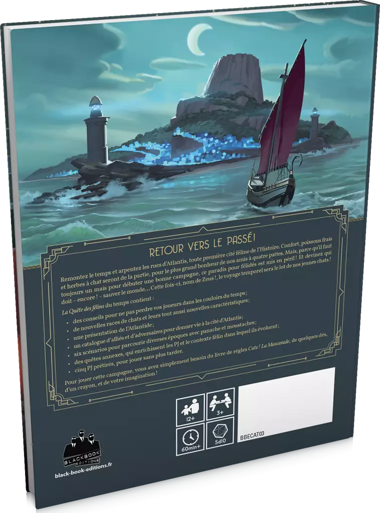 La Quête des félins du temps prend place dans la mythique cité féline d’Atlantis au travers de 5 scénarios rocambolesques et fantastiques. Les scénarios constituant cette campagne peuvent être joués dans n’importe quel ordre, mais ils convergent tous vers un seul sujet : la destruction annoncée de l’Atlantide !