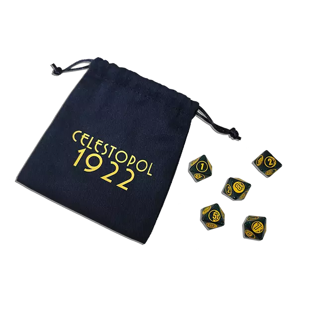 Célestopol 1922 : Le jeu de rôle, adaptation officielle des nouvelles d’Emmanuel Chastellière, repose sur le système Anomalie, simple et centré sur la narration et le roleplay. Il utilise pour ses résolutions deux dés à huit faces ainsi qu’un troisième, le dé de la Lune, qui viendra insuffler une touche d’imprévu à vos aventures.