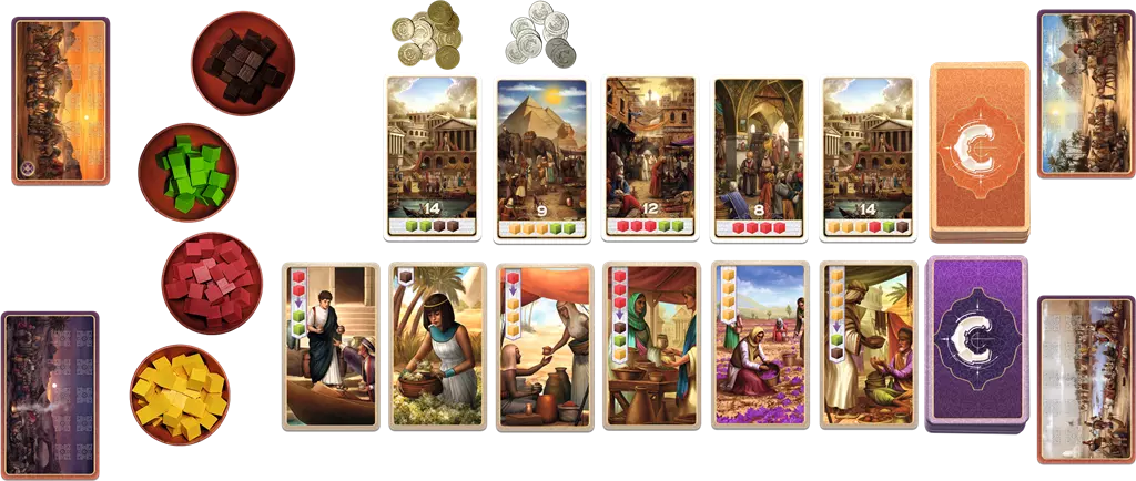 Les joueurs sont des chefs de caravane qui parcourent la célèbre route de la soie pour livrer des épices aux confins du continent pour la gloire et la richesse. Chaque tour, les joueurs effectuent l'une des quatre actions suivantes:Établir une route commerciale (en prenant une carte de marché)