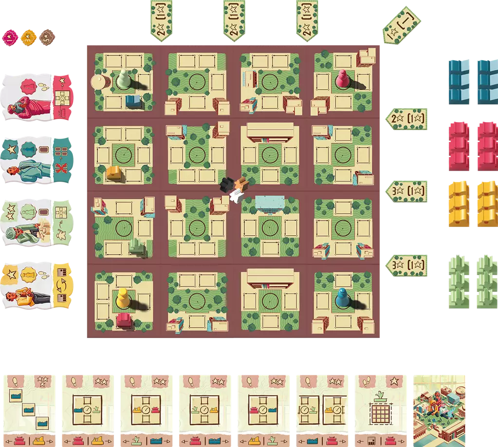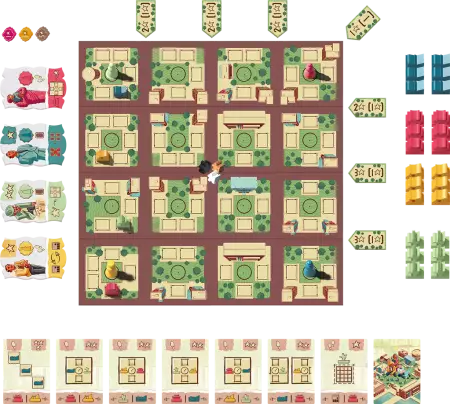 La partie se termine quand une couleur de bâtiment est épuisée. Vous pouvez encore accumuler des points en finalisant un projet ou en utilisant vos spécialistes pour des bonus finaux. Le décompte des rues ajoute une tension supplémentaire, rendant chaque décision finale cruciale. La possibilité d’épuiser les ressources permet des fins de partie variées, où l'anticipation et la prise de décision stratégique priment pour s'imposer comme meilleur urbaniste.