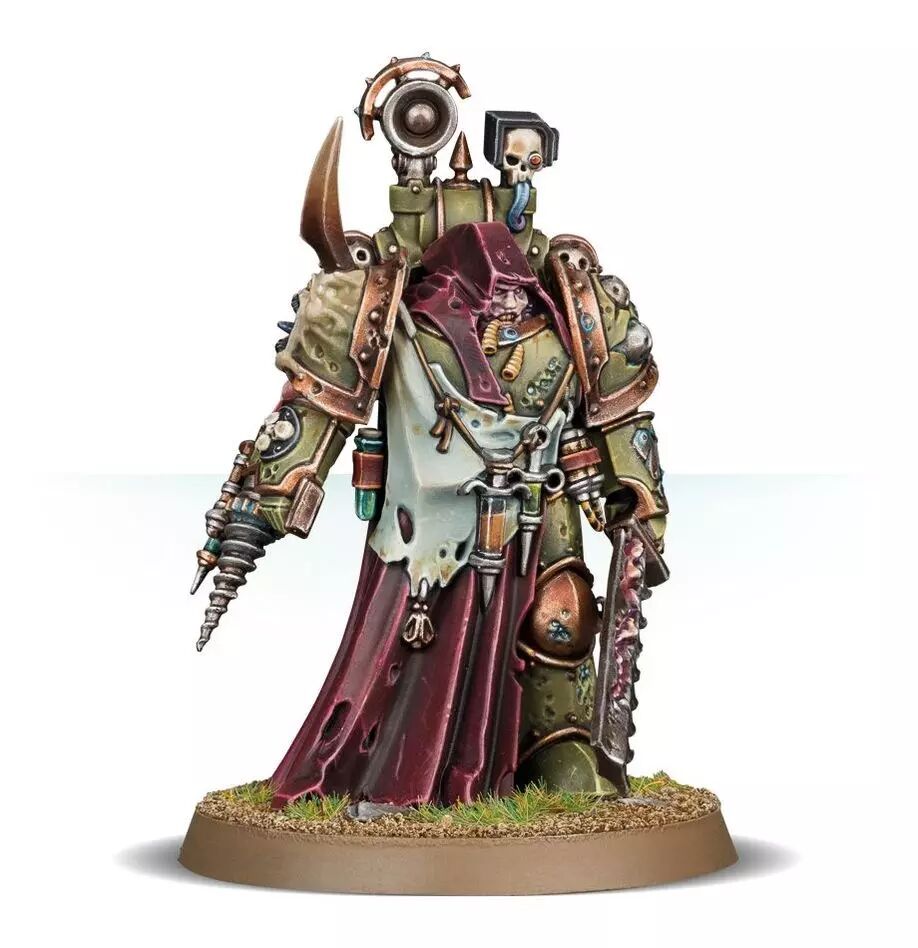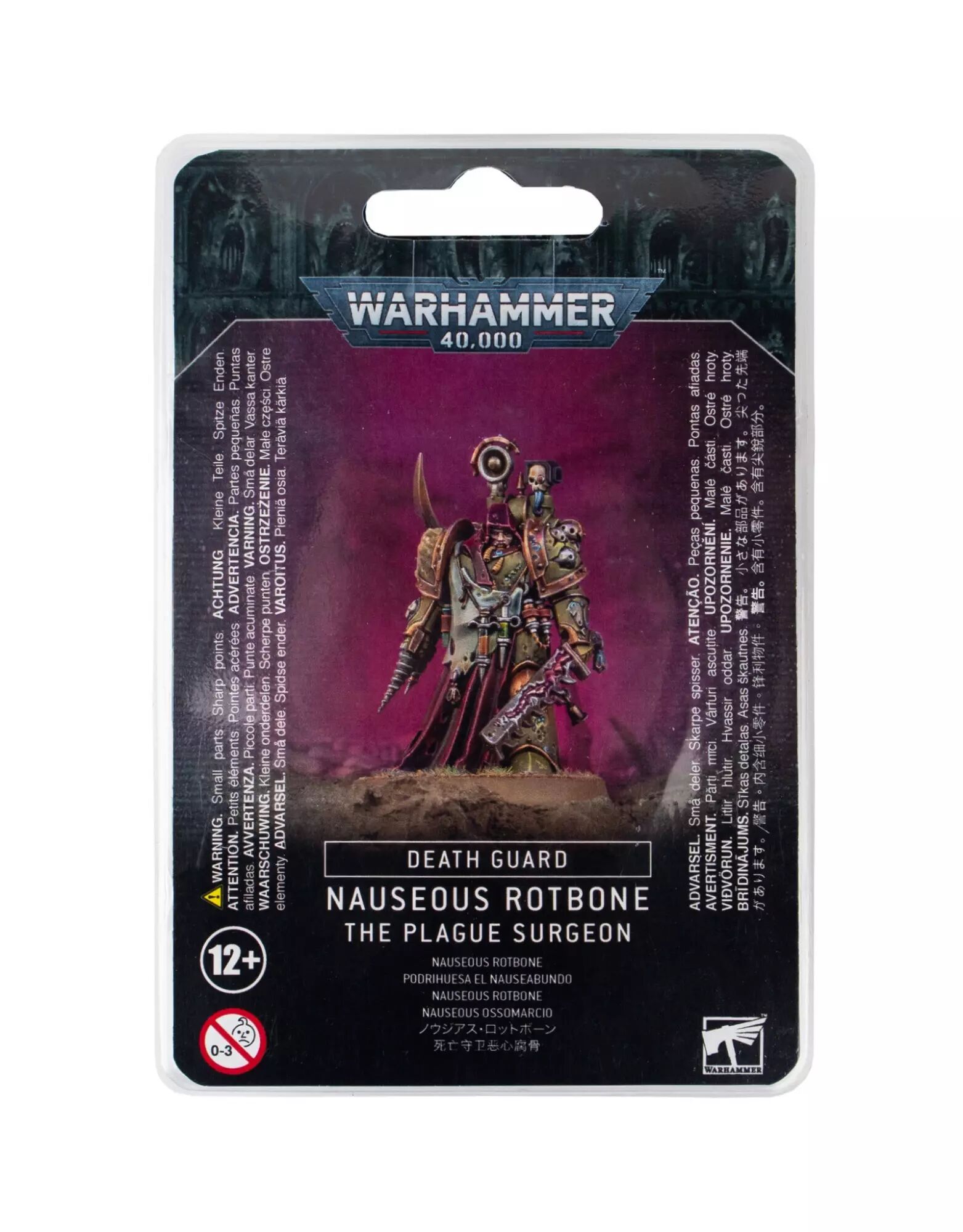 Sinistres personnages encapuchonnés, les Plague Surgeons hantent le cauchemar des combats comme des spectres funestes. Jadis, ces apothicaires de la Death Guard soignaient ceux qui pouvaient l’être, et absolvaient les autres. La damnation métamorphosa leur ordre en l’antithèse des médecins. Le simple contact d’un Plague Surgeon est contagieux au plus haut point, et leur haleine est saturée de spores et d’animalcules démoniaques. Le tout est aggravé par les miasmes émis par leur encensoir et l’ordure qui dégoutte de leurs armes comme de leurs instruments chirurgicaux. Tout adversaire assez fou pour affronter un Plague Surgeon au contact s’expose aux pires maladies empyréennes.Ce kit plastique contient les composants nécessaires pour assembler Nauseous Rotbone, un Plague Surgeon de la Death Guard. Il porte un pistolet bolter et une pestelame, mais son véritable intérêt se trouve chez les instruments médicaux corrompus, dont une parodie de narthecium porteur de maladies, dont il est bardé. Il a même sur le bras droit un antique reductor rouillé spécialement pour prélever le génogerme. Sa robe de bure encapuchonnée dissimule en grande partie une armure piquetée de corrosion typique de la Death Guard. Son épaulière droite est ornée d'une tête de plaguebearer, et son appareillage dorsal est… mais mieux vaut ne pas en parler.