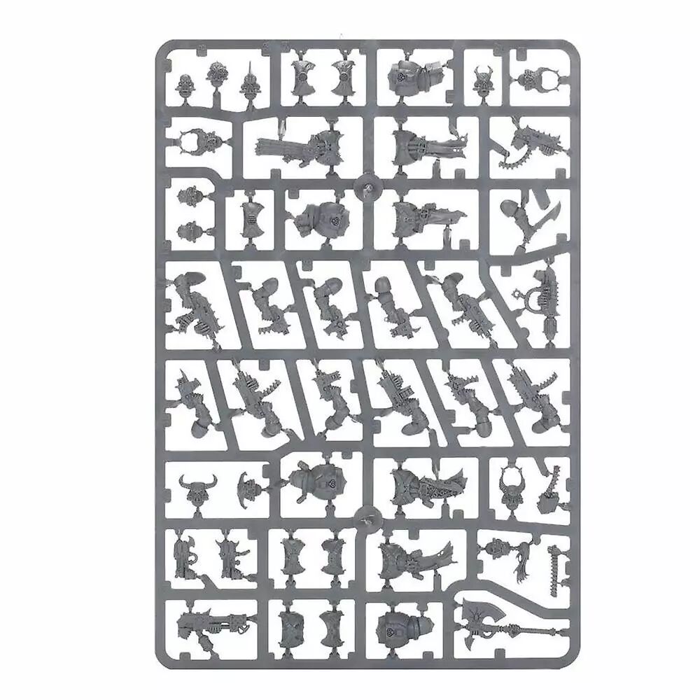 Ce kit permet de monter 10 Chaos Space Marines avec les armes de votre choix. Le tout regorge de pièces bonus, que vous choisissiez d'armer tous les membres de l'escouade d'armes de corps à corps et de pistolets, ou bien d'armes de tir. Vous disposez d'un fusil à plasma, d'un lance-flammes, d'un fuseur, d'un bolter lourd et d'un lance-missiles. Les composants optionnels peuvent servir à monter jusqu'à deux Aspiring Champions, ce qui vous confère le loisir de composer une escouade de 10 ou deux de 5. Une icône du Chaos, des pièces interchangeables et des grenades optionnelles élargissent encore votre choix, afin que toutes vos unités soient différentes. Le kit est même conçu pour être compatible avec celui des Havocs, de sorte que vous puissiez mélanger les armes lourdes pour étendre vos possibilités.