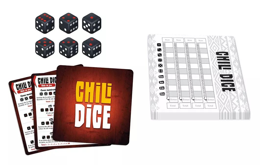 Contenu : - 6 dés - 1 bloc score - 4 cartes aide de jeu - la règle du jeu