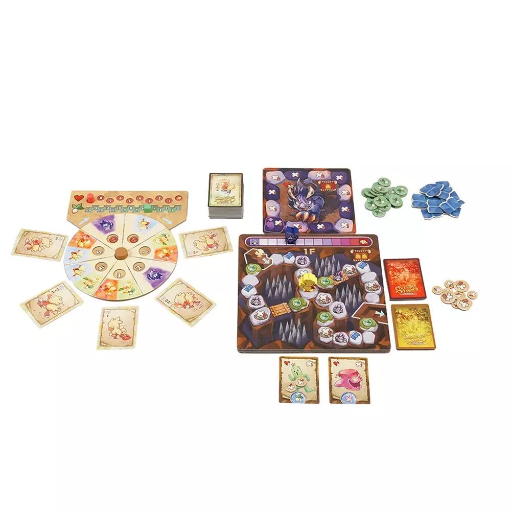 À chaque tour, de nouveaux adversaires arrivent. Discutez entre vous sans vous révéler vos cartes, puis choisissez une carte à jouer. Révélez-les, placez-les dans l'ordre, puis effectuez leurs actions ! Vous pourrez ainsi vous déplacer pour traverser le donjon, attaquer les monstres pour affaiblir et vaincre les créatures qui risquent de vous attaquer et manger pour reconstituer votre réserve de cartes… Mais attention à la faucheuse, qui ne doit pas atteindre le bout de sa piste ! Traversez les 4 étages pour rencontrer le boss du donjon : Behemoth ou Omega, des créatures emblématiques de la saga ! Battez-le pour remporter la victoire mais attention : Vous perdez si le chocobo perd tous ses points de vie, si la faucheuse rejoint soit le bout de la piste, soit le chocobo, ou si un joueur ne peut plus jouer de carte ! Relèverez-vous le défi ?