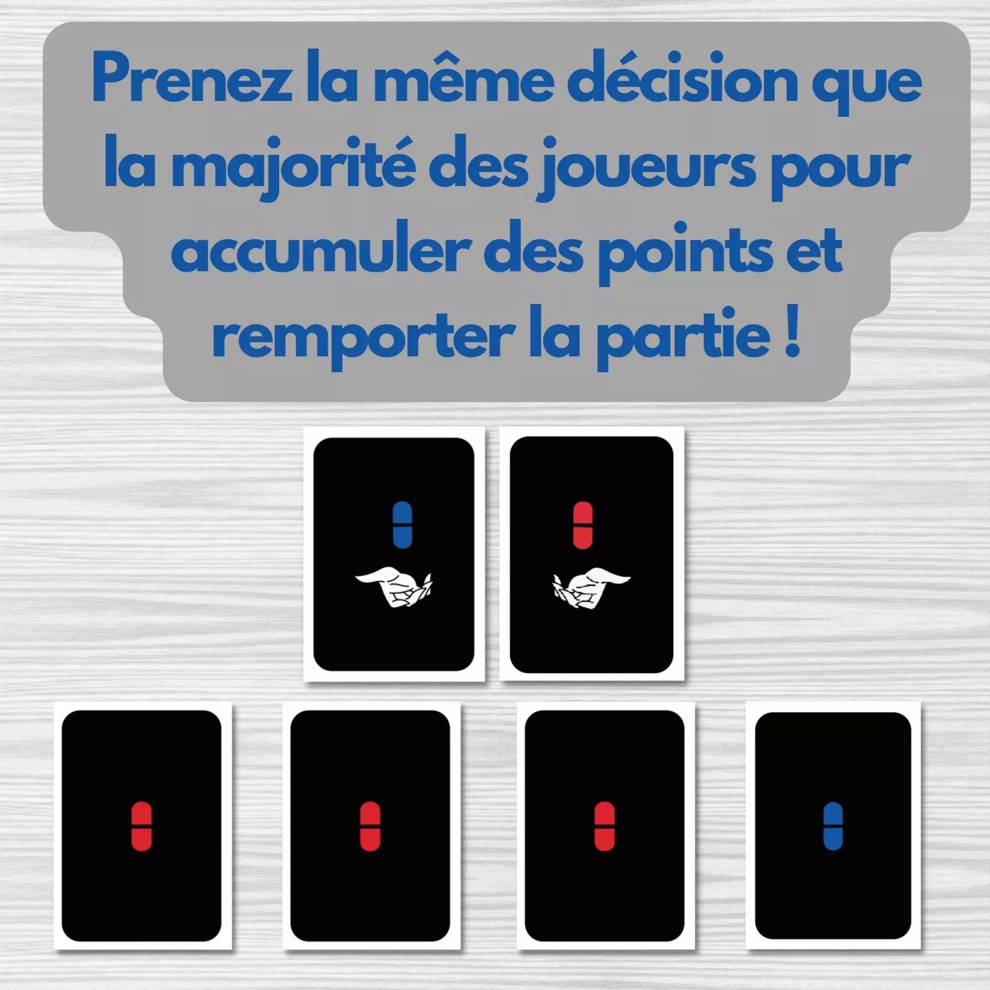 SIMPLE & EFFICACE : 1️⃣ À chaque tour, Le juge doit combiner 2 cartes dans le but de créer un dilemme. 2️⃣Les joueurs votent ensuite pour choisir la situation qu'ils préfèrent. 3️⃣ Prenez la même décision que la majorité des joueurs pour accumuler des points et remporter la partie !