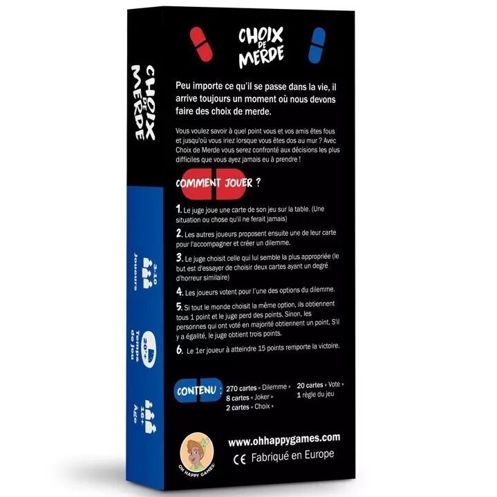 CHOIX DE MERDE est un jeu destiné aux adeptes de l'humour noir ou simplement à ceux qui aiment choisir entre des situations horribles. Ce jeu est souvent décrit comme une version extrême du célèbre jeu "Tu préfères ?".