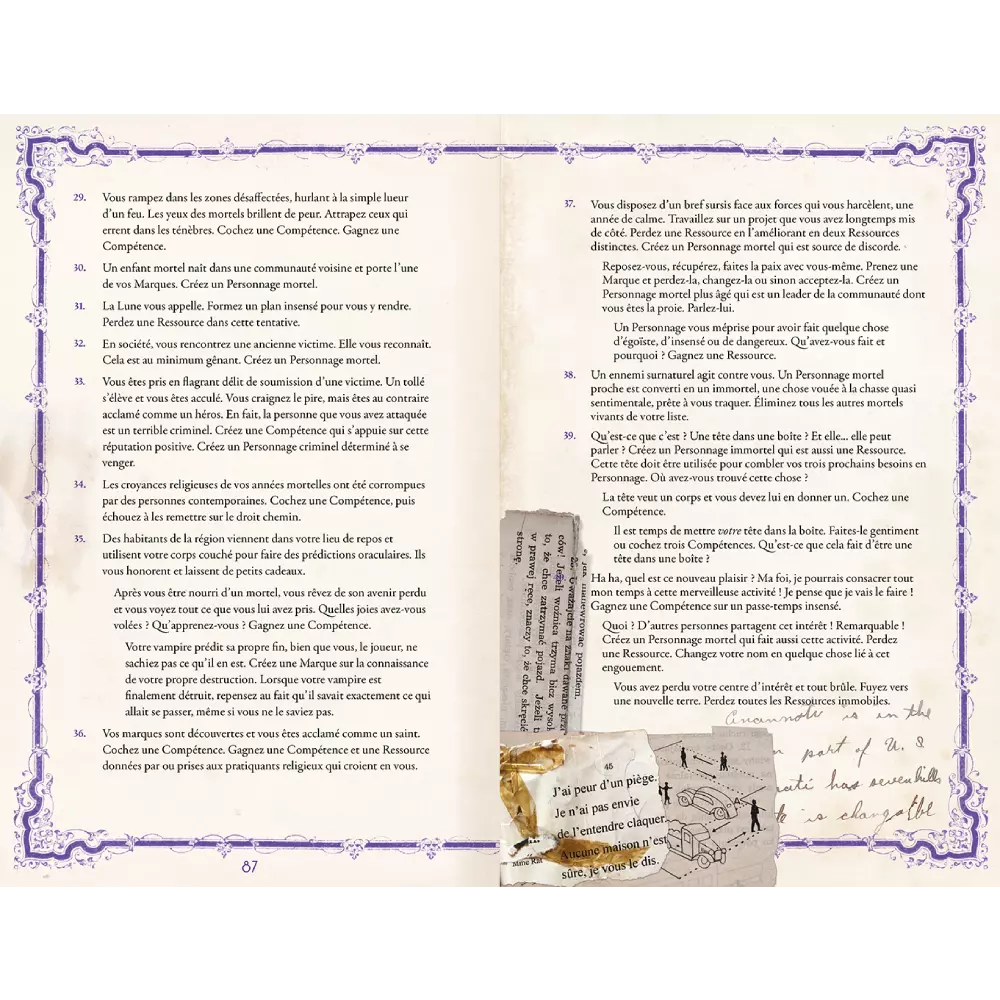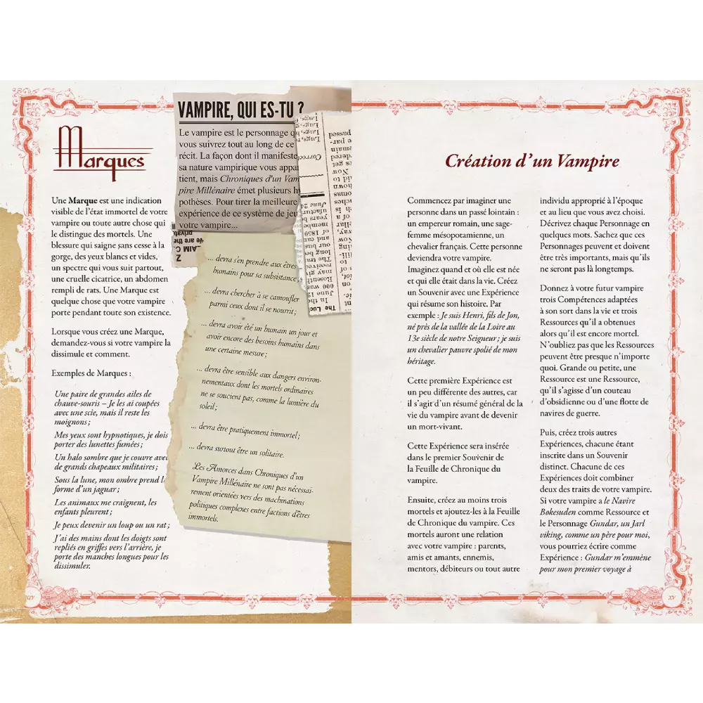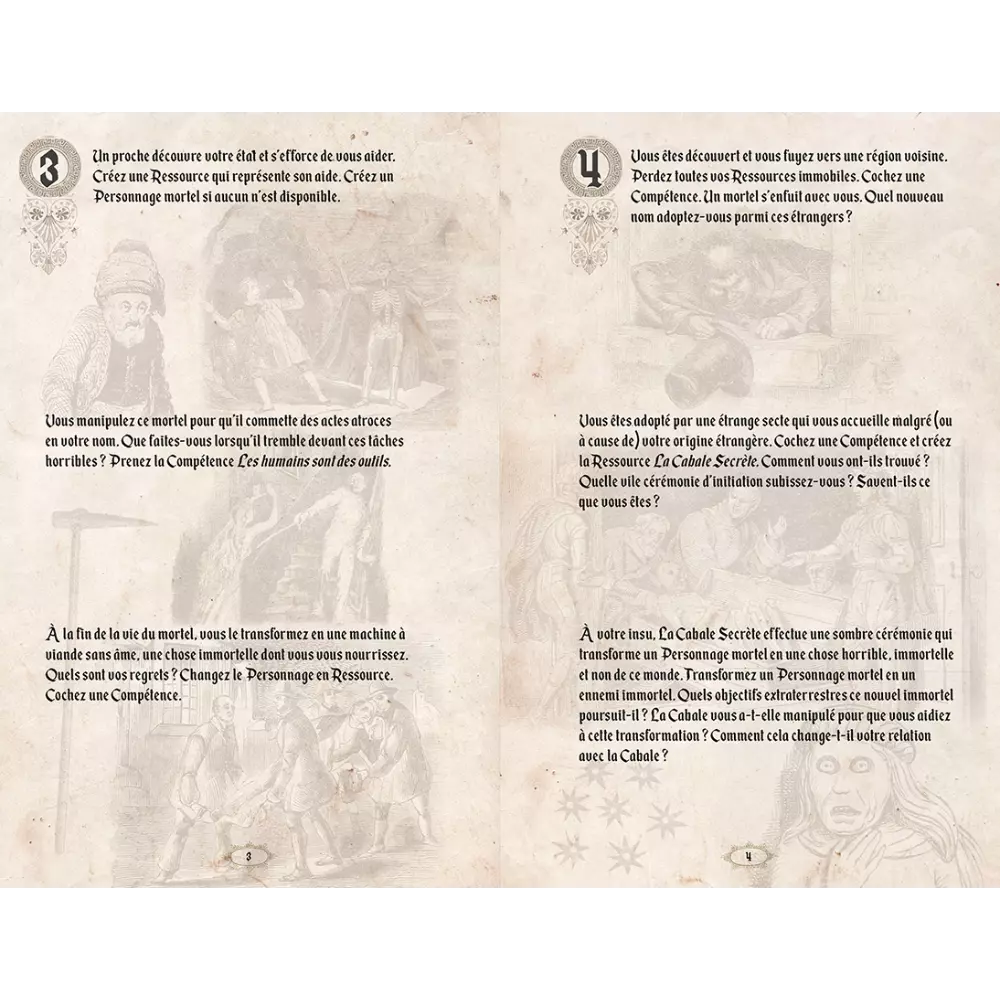 Incarnez un Vampire tout au long de son existence, écrivez votre propre histoire et laissez libre court à votre imagination pour une épopée vampirique inoubliable ! Guidé par des « Amorces » de récit, forgez votre propre histoire au travers des siècles, faites face à des situations difficiles, des choix moraux compliqués, tout en sachant qu’un jour la Mort vous tendra les bras. Mais n’oubliez pas que le temps passe, que vos Expériences vous façonnent et que vos Souvenirs s’effacent…