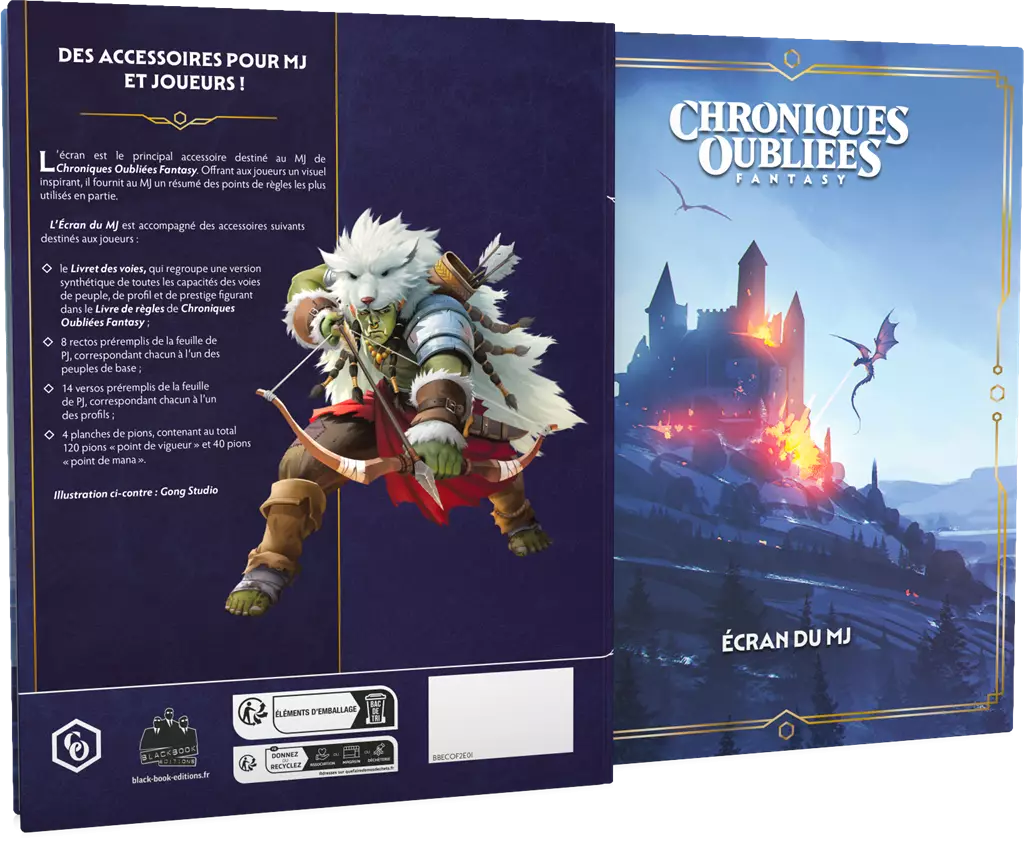 Réf. : BBECOF2E01 L'écran est le principal accessoire destiné au MJ de Chroniques Oubliées Fantasy. Offrant aux joueurs un visuel inspirant, il fournit au MJ un résumé des points de règles les plus utilisés en partie. Il accompagné de nombreuses aides de jeu