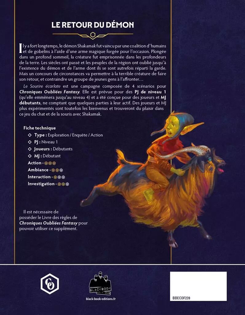 Le sourire écarlate est une campagne en 4 scénarios pour Chroniques Oubliées Fantasy 2. Elle est prévue pour être jouée par des personnages débutants de niveau 1, mais également par des joueurs et un maître de jeu débutants ou n’ayant pas beaucoup d’expérience du jeu de rôles. En résumé, c’est l’outil idéal pour se lancer dans la grande aventure.