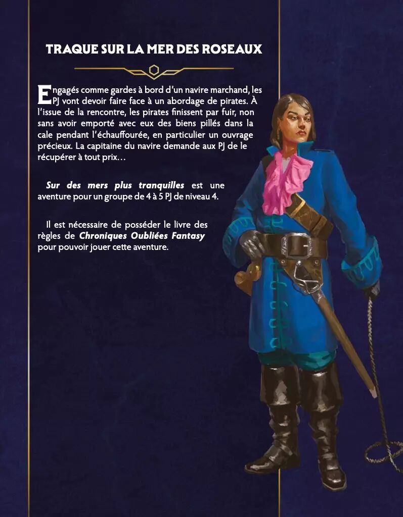 Réf. : BBECOF213 Sur des Mers Plus Tranquilles est un scénario conçu pour des PJ de niveau 4. À la poursuite de pirates ayant dérobé un manuscrit important, les joueurs se retrouvent mêlés à une intrigue politique.