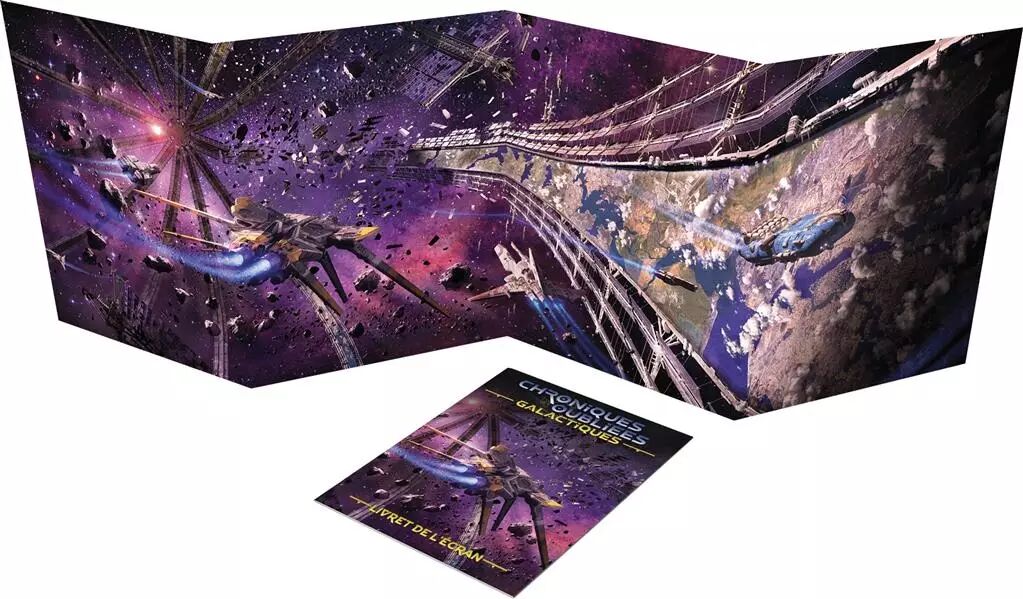 L'Écran du MJ est l'outil indispensable du meneur de jeu de Chroniques OubliéesTM Galactiques : ses quatre volets en mode portrait contiennent une synthèse des règles et toutes les tables qui seront utiles au MJ durant ses parties. De leur côté, les joueurs pourront admirer une vue de la gigantesque station Omega qui les plongera dans l'ambiance du jeu.