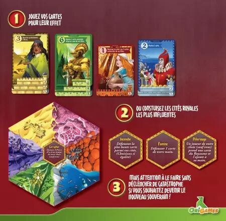 Dans Cités Royales, chaque décision compte. Recrutez des héros, collectez des taxes ou construisez vos cités. Chaque carte peut être utilisée de multiples façons, offrant des choix tactiques cruciaux. Une mécanique de bluff et de gestion des ressources permet des retournements de situation mémorables.