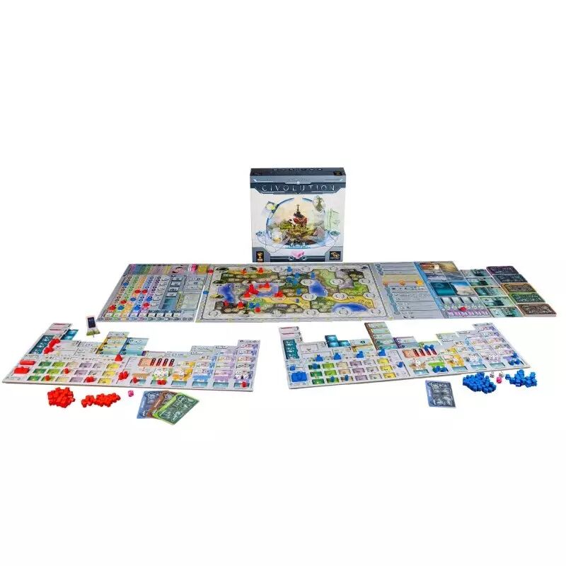 Civolution impressionne par la qualité de ses composants. Chaque joueur dispose d’un plateau double couche pour organiser ses modules technologiques, tandis que les dés et tuiles sont soigneusement