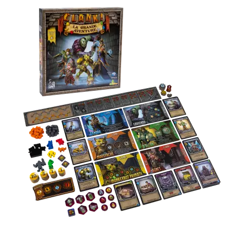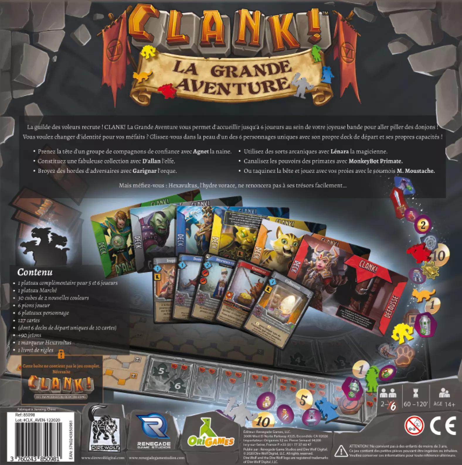 La guilde des voleurs recrute ! CLANK! La Grande Aventure vous permet d'accueillir jusqu'à 6 joueurs au sein de votre joyeuse bande pour aller piller des donjons ! Vous voulez changer d'identité pour vos méfaits ? Glissez-vous dans la peau d'un des six personnages uniques avec son propre deck de départ et ses propres capacités ! Mais méfiez-vous : Hexavultus, l'hydre vorace, ne renoncera pas facilement à ses trésors...