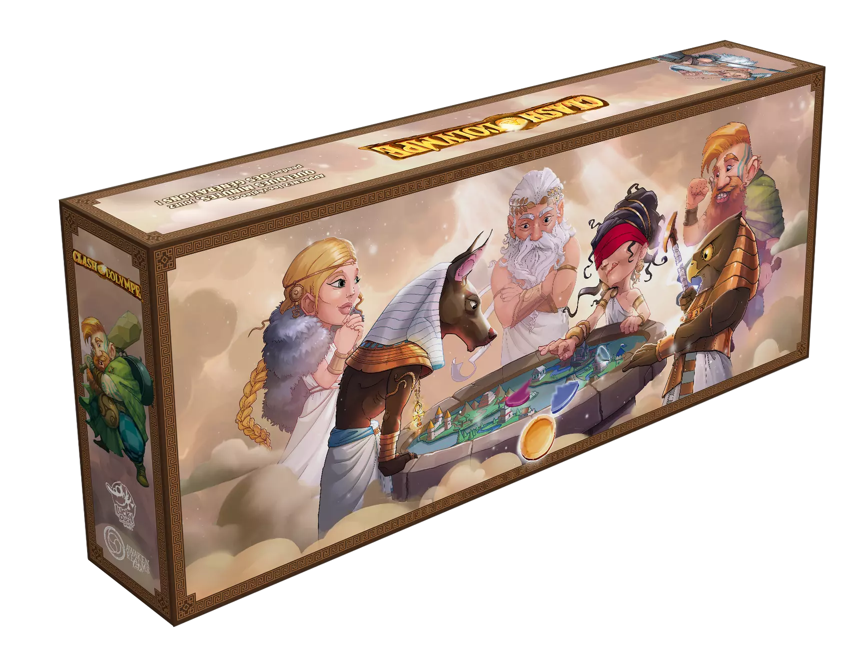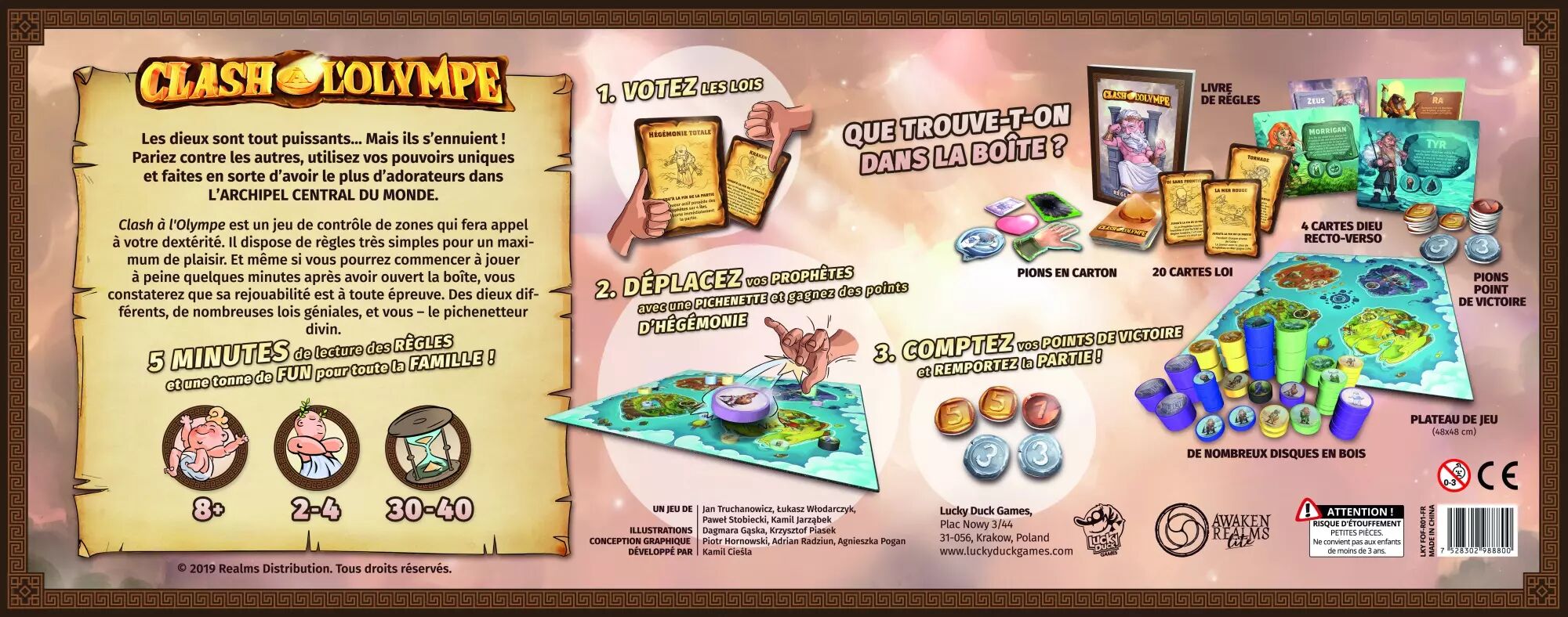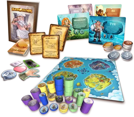 Réf. : JDPLDG027 Clash à l'Olympe est un jeu de pichenettes et de contrôle de zones dans lequel les joueurs incarnent différents dieux. Leur but est de fixer les Lois du territoire, d'envoyer les Prophètes (disques) sur les Îles d'une pichenette et de convertir le plus grand nombre d'habitants (représentés par des Points de Victoire). Le dieu qui a obtenu le plus de Points de Victoire est déclaré vainqueur !