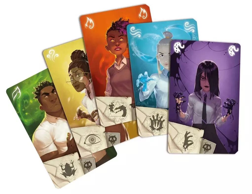 4. Lancez des sorts interdits en défaussant un élève adjacent à deux autres élèves de la même couleur. Chaque couleur a un effet unique pour entraver votre adversaire, mais vous pouvez aussi opter pour l'effet noir, qui le contraint à défausser la moitié de ses cartes.