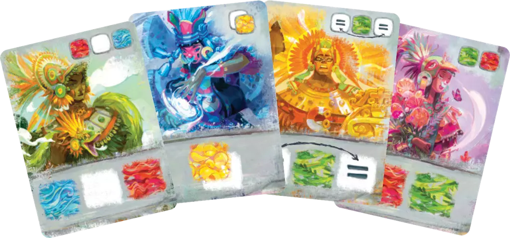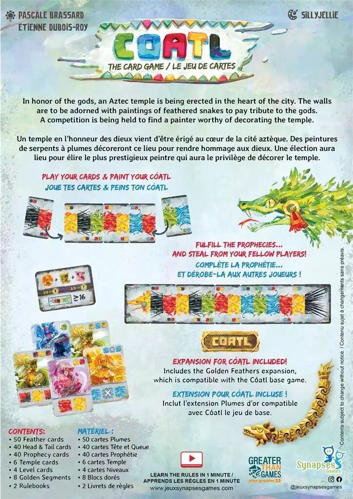 Dans Cóatl le jeu de cartes, les joueurs tentent de peindre le plus beau et précieux serpent à plumes. Le serpent, ou Cóatl, est composé d’une carte Tête, d’une carte Queue et de huit cartes Corps.