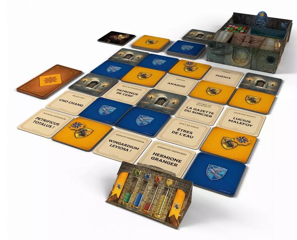 Dans Codenames : Retour à Poudlard, le château devient votre terrain de jeu. Que vous apparteniez à Gryffondor ou Serpentard, votre mission est de localiser vos membres avant l'équipe adverse. Les Préfets connaissent l'emplacement de chaque carte sur la grille grâce à une carte Plan secrète, mais ils ne peuvent donner qu'un seul mot et un chiffre comme indice. "Potions : 2" ? À vous de déduire si cela désigne une fiole de Felix Felicis, le professeur Rogue ou une salle de classe spécifique !