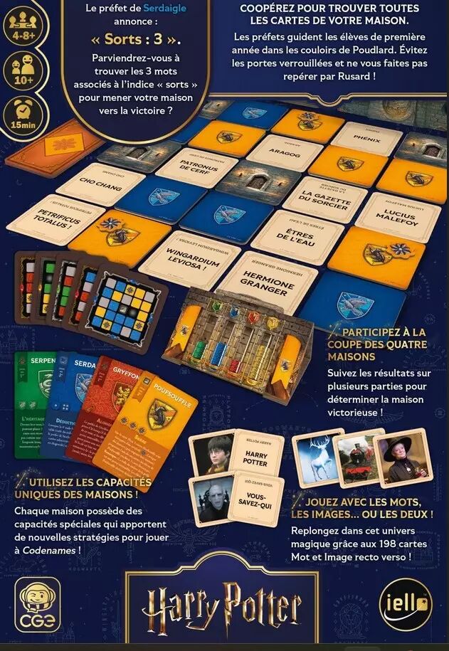 Contenu : 198 cartes Mot et Image, 72 cartes Plan, 1 socle, 9 tuiles Maison de chaque couleur, 1 jeton Choixpeau magique, 6 tuiles Mission.