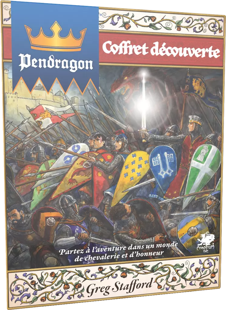 Ce starter set pour le jeu de rôle Pendragon contient tout ce dont un meneur de jeu a besoin pour faire vivre à une bande de personnages fraîchement anoblis plusieurs aventures dans la Grande-Bretagne historique et fantastique du roi Arthur.