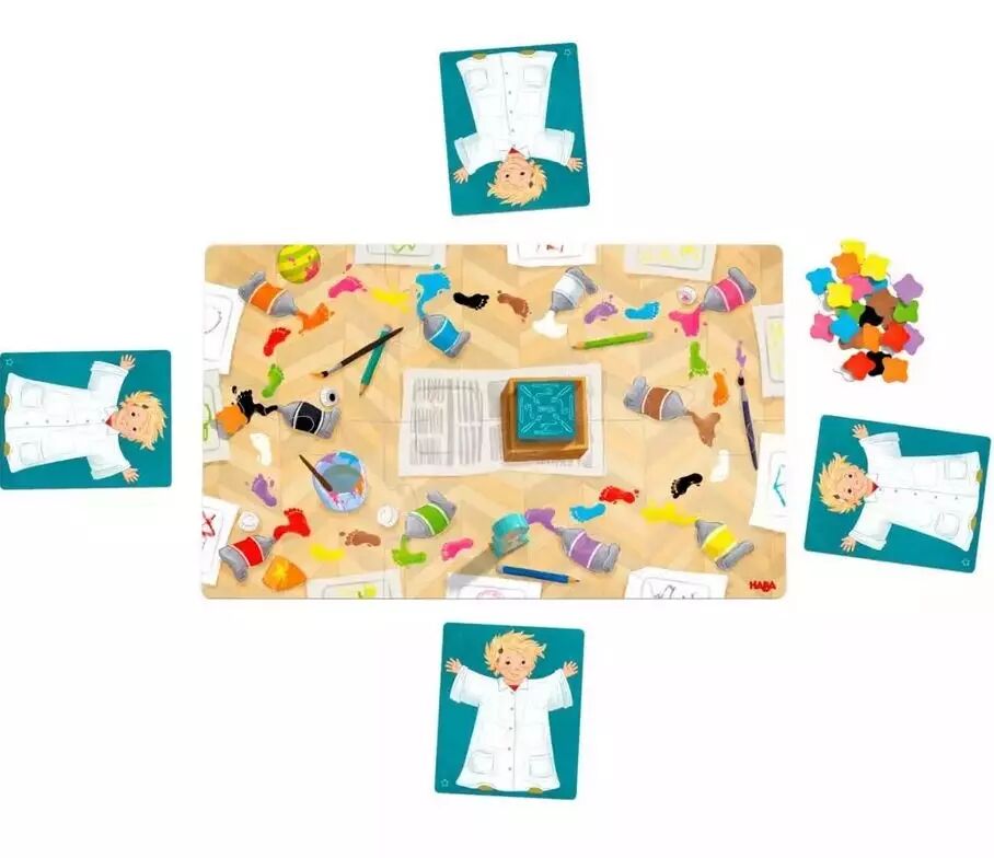 Jeu de plateau pour collecter des taches de couleur avec une règle compétitive et une règle coopérative. On assemble le plateau de jeu et chaque joueur reçoit un plateau avec Barbouille portant une grande blouse de peinture. Chaque joueur à son tour retourne une carte qui montre un objet avec 1, 2, 3 ou 4 couleurs. Le joueur nomme une des couleurs et fait avancer la figurine sur la prochaine tache de couleur correspondante. Si cette tâche sort d'un tube de peinture, il peut alors prendre une tuile "tache de peinture" et la placer sur sa blouse. Il faut donc bien choisir la couleur! Si le joueur retourne une carte chien, il doit nommer la couleur du pinceau volé par le chien, se lever et trouver dans la pièce un objet de la même couleur. Dès qu'un joueur a collecté 7 tâches il gagne la partie. En version coopérative on doit collecter 10 tâches avant que tous les chiens encerclent le plateau de jeu. Un jeu pour approfondir sa connaissance des couleurs avec un zeste de stratégie!