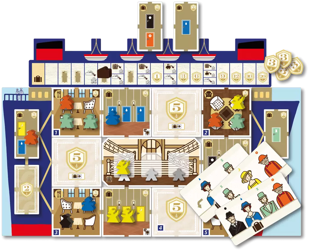 À chaque tour, choisissez une de vos cartes passagers et prenez les pions correspondants. Puis distribuez-les dans les salles de votre paquebot à la façon d’un awale, le premier passager dans une pièce, le suivant dans une pièce à côté, et ainsi de suite. Ce faisant, arrangez-vous pour remplir les salles en respectant les couleurs et les prérequis. Sinon, vous risquez d’avoir des passagers mécontents, et de perdre des points !Au début du XXe siècle, les transatlantiques et autres longs trajets devinrent accessibles au plus grand nombre : de luxueux paquebots furent alors construits. Les joueurs, qui incarnent les membres d’équipage d’une compagnie maritime, sont chargés de l’embarquement des passagers le jour du départ. Ils devront non seulement guider ces clients vers leurs cabines, mais aussi répondre à leurs besoins spécifiques. Parviendrez-vous à faire embarquer tous vos passagers et à satisfaire leurs exigences avant que le vaisseau ne lève les voiles ?
