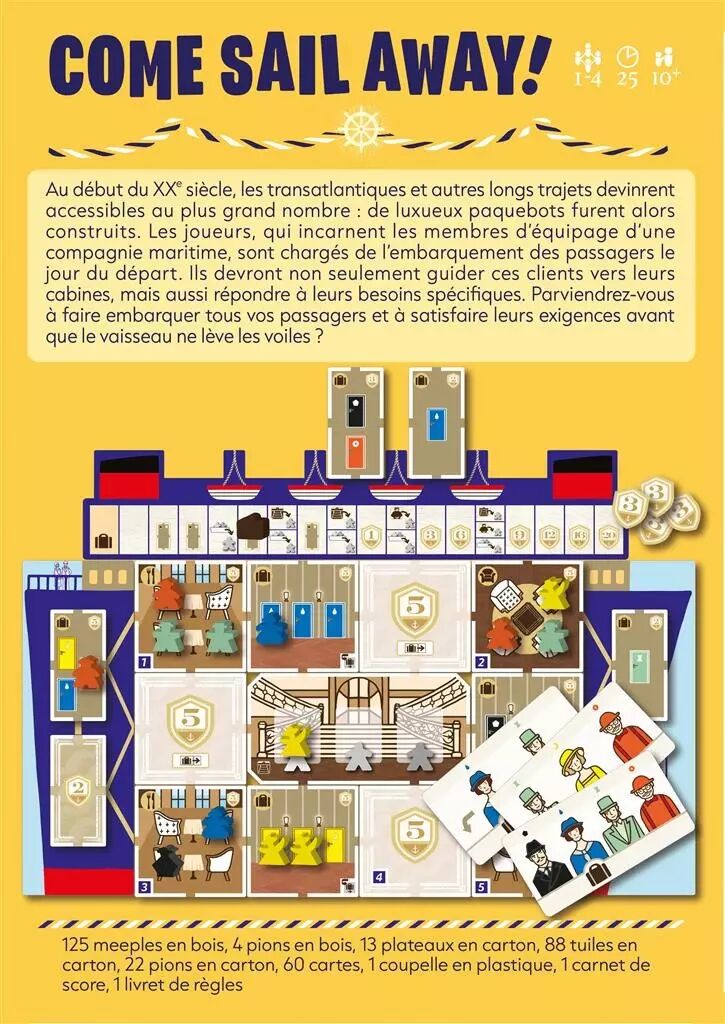Dans Come Sail Away, chaque joueur incarne un membre d’équipage chargé d’embarquer des passagers sur un paquebot de luxe. Il faudra optimiser le placement des voyageurs dans les cabines, anticiper leurs besoins et gérer la piste des bagages pour débloquer bonus et nouvelles opportunités. Les points sont gagnés en remplissant les cabines et en étant le plus rapide à satisfaire certaines conditions. La gestion fine de l’espace et la planification à moyen terme sont au cœur du jeu, créant une dynamique à la fois tendue et gratifiante.