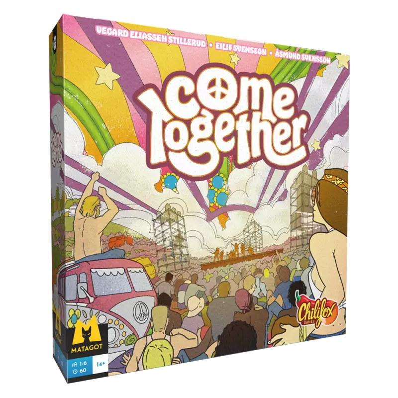 Comment imaginer meilleur thème pour un jeu de placement d'ouvriers que celui de Woodstock ? Dans Come Together vous allez organiser votre propre festival de musique. Recrutez les roadies pour installer les différentes scènes dont vous ferez l'acquisition. Bien entendu il faudra bien communiquer sur votre évènement c'est pourquoi vous investirez dans les annonces radio, télé ou les flyers. Mais le plus important sera de faire venir les groupes de musiques correspondant au mieux aux différents publics.