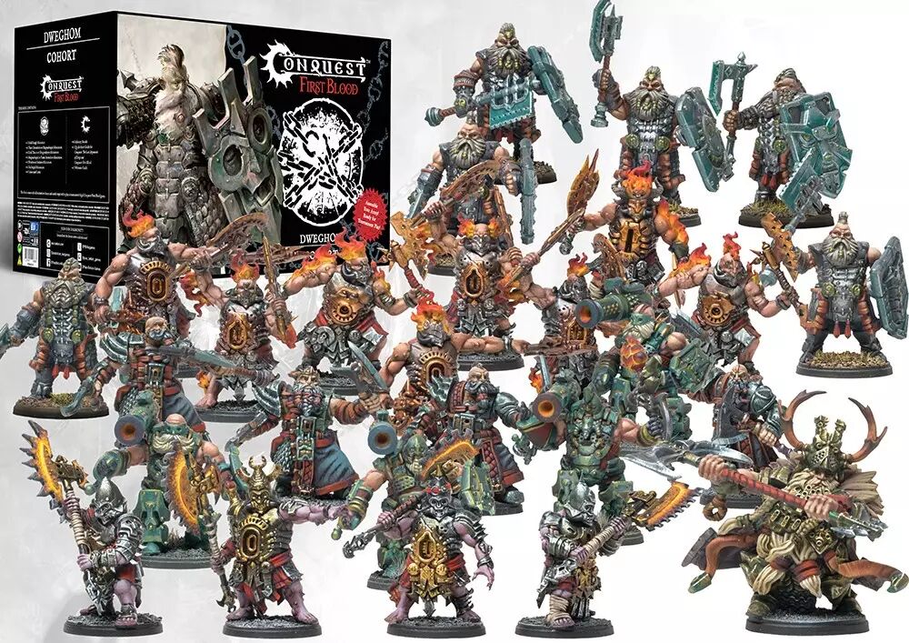 Ce set de cohorte Dweghom comprend un Raegh de Fort, 6 Thanes de Fort, 4 Magmaforgés, 8 Berserkers de Flamme, 4 Forgés de Feu et 4 Gardiens. 27 figurines au total, avec leurs socles et socles, leurs cartes de commandement, leurs instructions d'assemblage, leur guide de démarrage rapide et leur guide de bienvenue. Comment jouent les Dweghoms ? Les armées Dweghoms sont lentes, coriaces et implacables, comme on peut s'y attendre de leurs ancêtres. Mais ce qui les rend vraiment uniques, c'est leur magie. Grâce à une magie de combat et des sorts défensifs exceptionnels, Dweghom est capable de se transformer en véritable ouragan élémentaire sur le champ de bataille, projetant des murs de feu et ralentissant ses ennemis en retournant contre eux la terre sur laquelle ils se trouvent. Grâce à une infanterie d'élite très puissante et à de solides choix d'unités spécialisées hors infanterie, les joueurs de Dweghom ont tendance à décider où ils veulent aller et à s'y frayer un chemin sans relâche, quelles que soient les circonstances.
