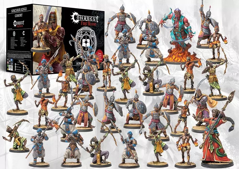 Ce set Cohorte des Rois Sorciers comprend un Sorcier, un Sardar, 8 Initiés Maharabatis, 8 Ghols, 8 Rajakur, 8 Disciples Dhanur et un Danseur d'Épée Efreet. 35 figurines au total, avec leurs socles et socles, leurs cartes de commandement, leurs instructions d'assemblage, leur guide de démarrage rapide et leur guide de bienvenue. Comment jouent les Rois Sorciers ? Régiments de soldats élémentaires, esprits de l'Air et du Feu, ainsi que bêtes légendaires et maléfiques, les Rois Sorciers déploient une multitude de forces magiques sur le champ de bataille. Dotés d'une puissante magie élémentaire, de nouvelles règles rituelles puissantes et d'un vaste arsenal magique. Chaque sort et rituel appartient à un élément. Lorsque ces puissantes magies sont libérées, les forces élémentaires du même élément sont renforcées, subissent un second souffle et sont rajeunies, tout en agissant comme de puissants canaux de lancement de sorts. En tant que commandants puissants et influents, l'élément humain n'est pas en reste au sein de la faction. Soldats et archers professionnels et hautement entraînés, les meilleurs du marché, ainsi que les Mahuts en armure complète, brisent les lignes ennemies, offrant à leurs frères élémentaires l'occasion de s'infiltrer dans les formations ennemies et de semer le chaos.