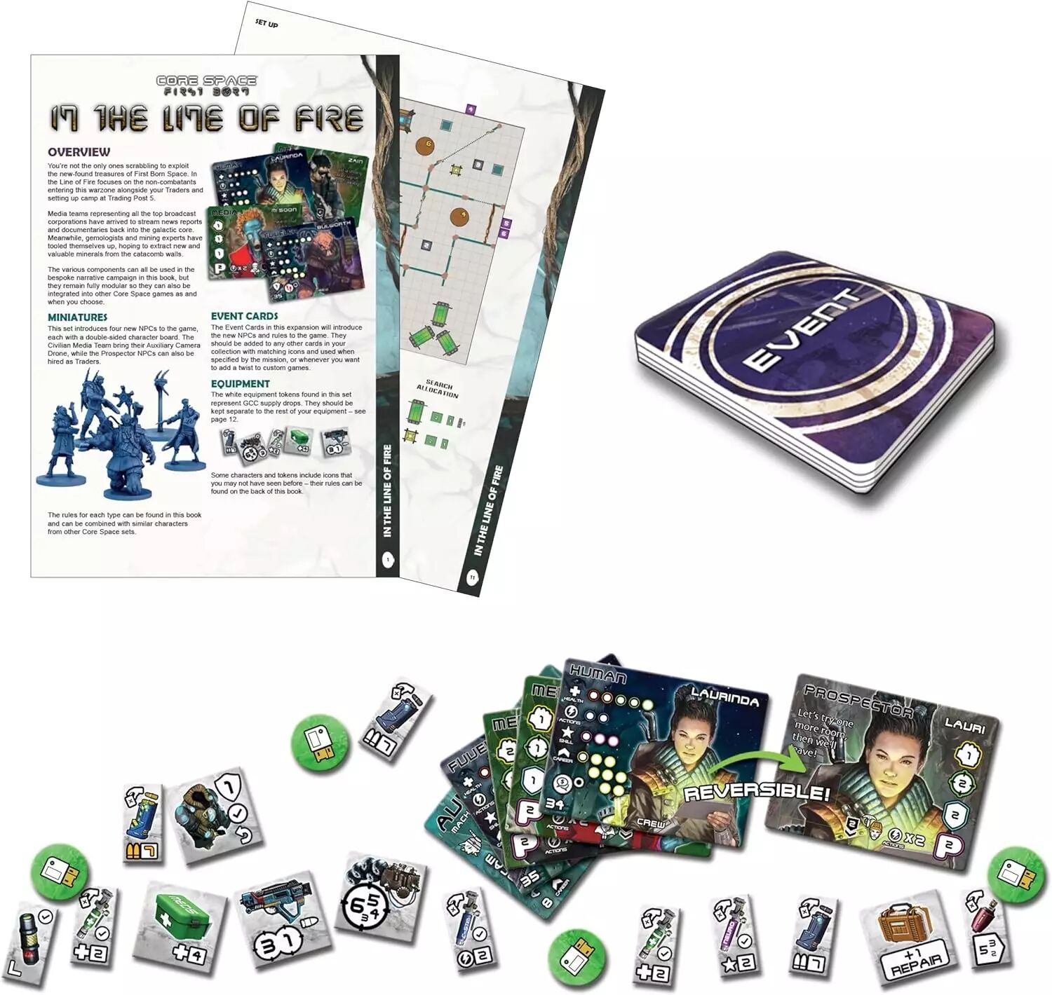 Réf. : BSGCSE015 Intégrez les civils à vos missions - cette extension ajoute 8 figurines de non-combattants (Civils, Prospecteurs, Mineurs), 8 fiches de personnages, 4 fiches de classe, 6 cartes Événements exclusives et la mécanique de minage de cristaux pour exploiter les ressources locales.
