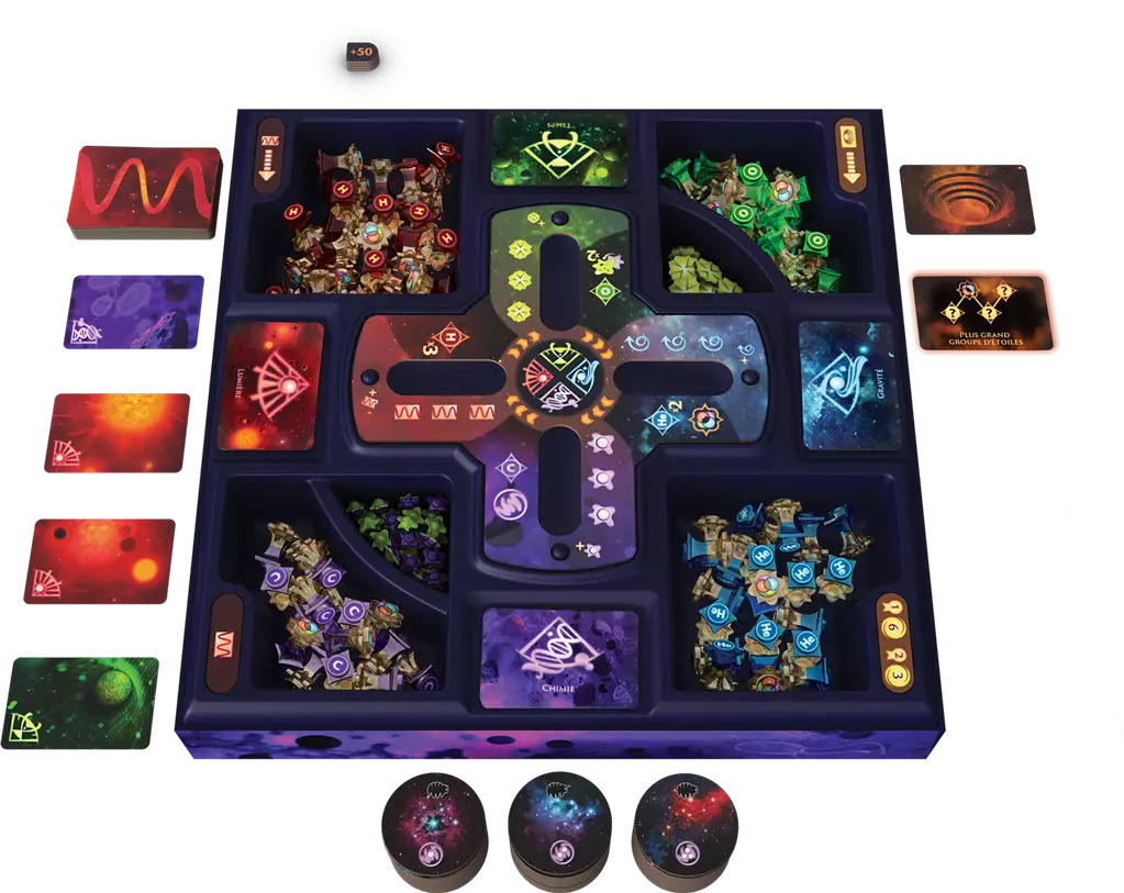 Contenu de la boîte : 1 plateau principal, 4 plateaux joueur, 60 cartes Énergie, 32 cartes Pouvoir, 16 cartes Objectif universel, 12 billes éléments, 26 pions Étoile hydrogène, 20 pions Étoile hélium, 16 pions Étoile oxygène, 16 pions Étoile carbone, 50 pions Vie, 18 pions Cristal temporel, 12 marqueurs Ressource, 16 pions Pouvoir, 48 tuiles Nébuleuse, 24 pions Forme de vie avancée, 4 pions +50/+100 Points, 4 marqueurs de fin de tour, 2 supports de cartes, 1 livret de règles.