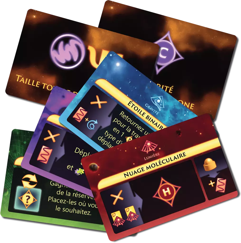Au début de la partie, chaque joueur possède un plateau aussi vide que le vide intersidéral. Au fil des tours, vous ferez naître des étoiles, des nébuleuses, des formes de vie, etc.