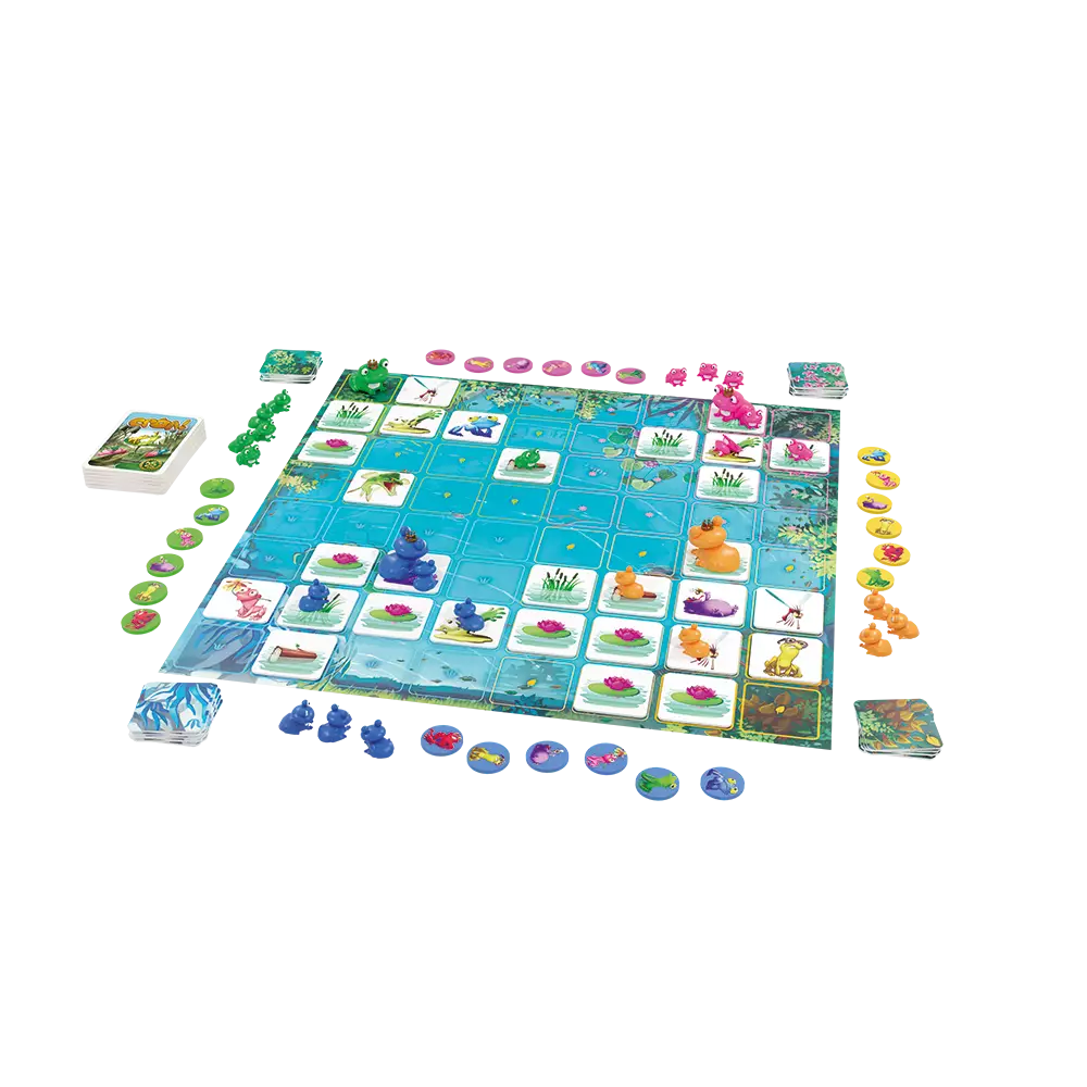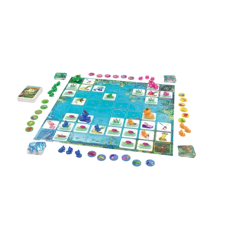 Dans Crôa!, chaque joueur contrôle une colonie de grenouilles menée par une reine. Le but ? Être le dernier à conserver sa souveraine en jeu. Les mécaniques sont accessibles : déplacez vos grenouilles, retournez des tuiles et appliquez leurs effets, mais attention aux brochets et aux adversaires prêts à tout pour régner sur la mare ! Un module de mémoire en option ajoute un défi supplémentaire pour les plus audacieux.